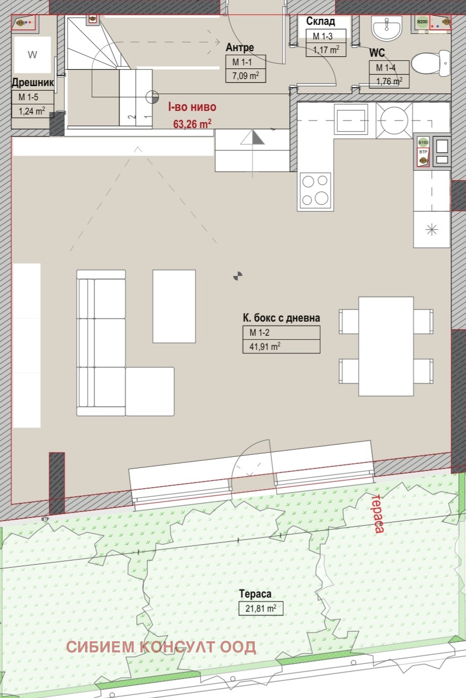1-во ниво - входно антре, изключително просторна и обширна дневна с кухн. бокс, дрешник/килер, складово помещение, тоалетна и озеленена тераса (ограден малък двор 22кв.м.);