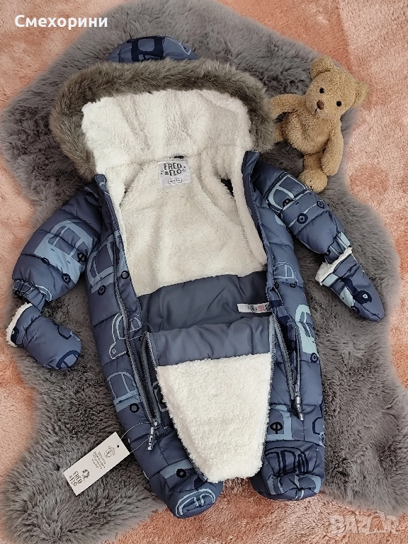 Нов бебешки зимен космонавт ⭐ Fred & Flo ⭐ за момченце 0-3 месеца и ръст 62см. С ръкавички и с два ципа по цялата дължина на тялото за по-лесно и удобно обличане. Влагоустойчив.