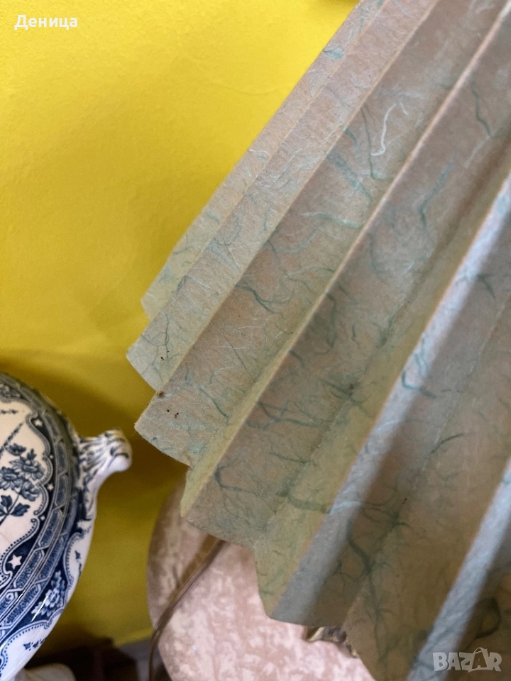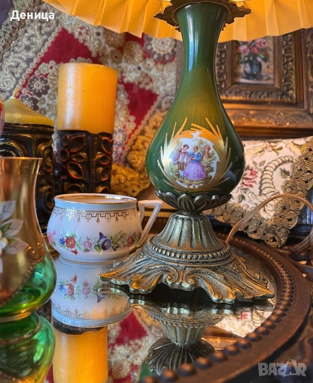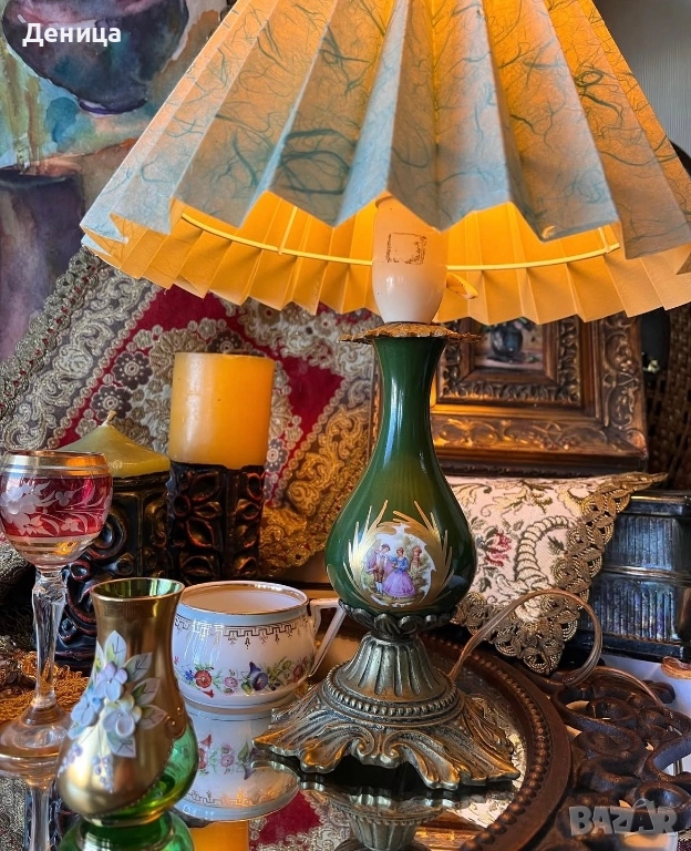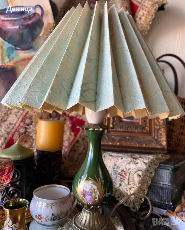 Месингова основа, красив зелен порцелан, украсен с романтични сцени и плисирана картонена шапка/ абажур