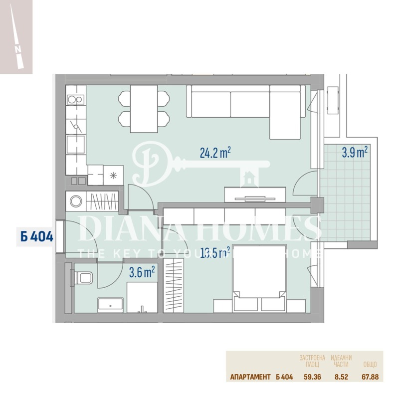 Предлаганият апартамент е на 2-ти жилищен етаж (3-ти надземен), със застроена площ 59,36 кв.м и обща площ 67,88 кв.м. Състои се от дневна с кухненски бокс - 24,20 кв.м, спалня - 13,50 кв.м, баня с тоалетна и тераса. Изцяло източно изложение. Отопление - на ТЕЦ.
