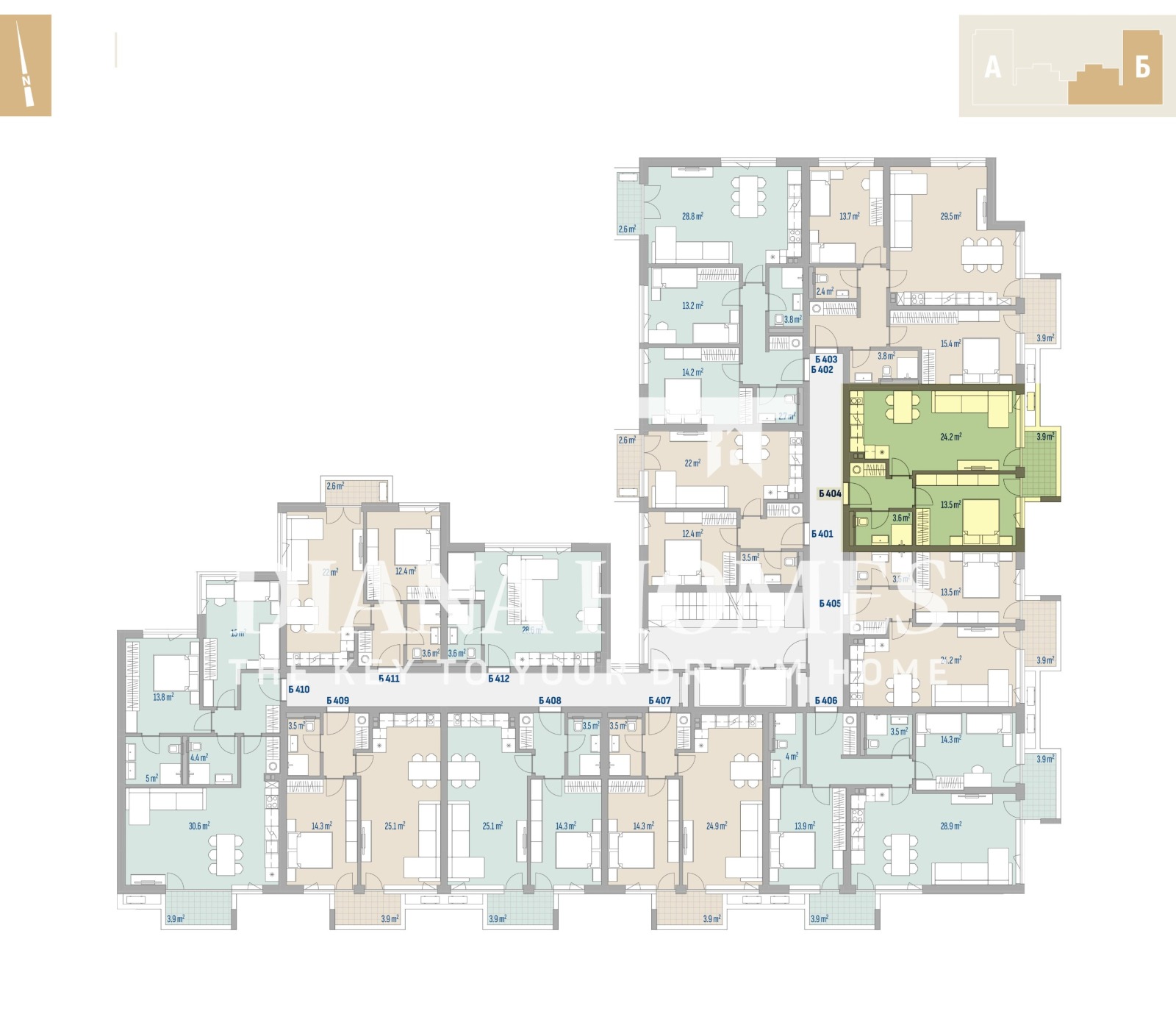 Агенцията предлага избор от едностайни, двустайни и тристайни апартаменти в сградата, както и паркоместа, подземни и надземни гаражи.