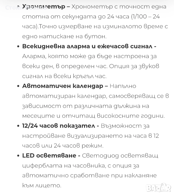 Екстри: Хронометър – Хронометър с точност една стотна от секундата до 24 часа (1/100 – 24 часа).Точно измерване на изминалото време с едно натискане на бутон. Всекидневна аларма и ежечасов сигнал - Аларма, която може да бъде настроена за всеки ден, в определен час. Опция за звуков сигнал на всеки кръгъл час. Автоматичен календар – Напълно автоматизиран календар, самосверяващ се в зависимост от различната дължина на месеците и отчитащ високосните години. 12/24 часов показател - Възможност за настройване визуализирането на часа в 12 часов или 24 часов режим. LED осветяване - Светодиод осветяващ циферблата на часовника, с опция за автоматично сработване при накланяне към лицето.