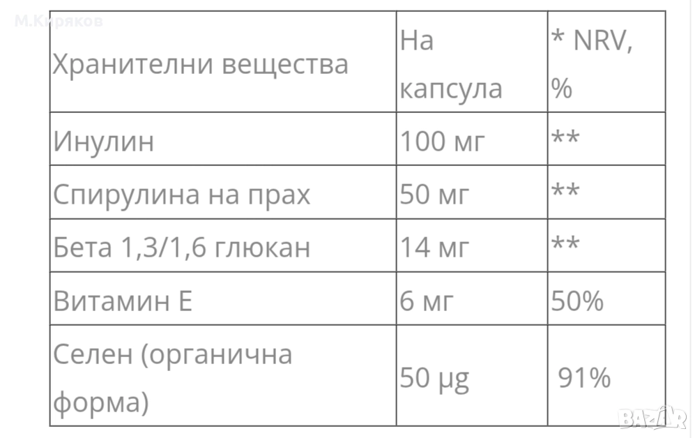 * Състав: бета-глюкан 1.3/1.6 , инулин , спирулина (лат. Spirulina platensis ) , селен , витамин Е.