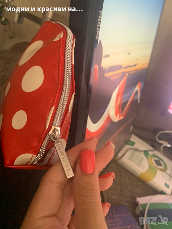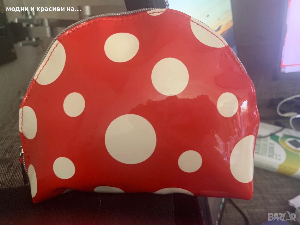 Третият несесер е на японския козметичен бранд Shiseido. Много ефектен и кокетен. Материята е лачена и лъскава, а дизайна страхотен- огнено червен фон на големи и по-малки бели точки. Перфектно състояние