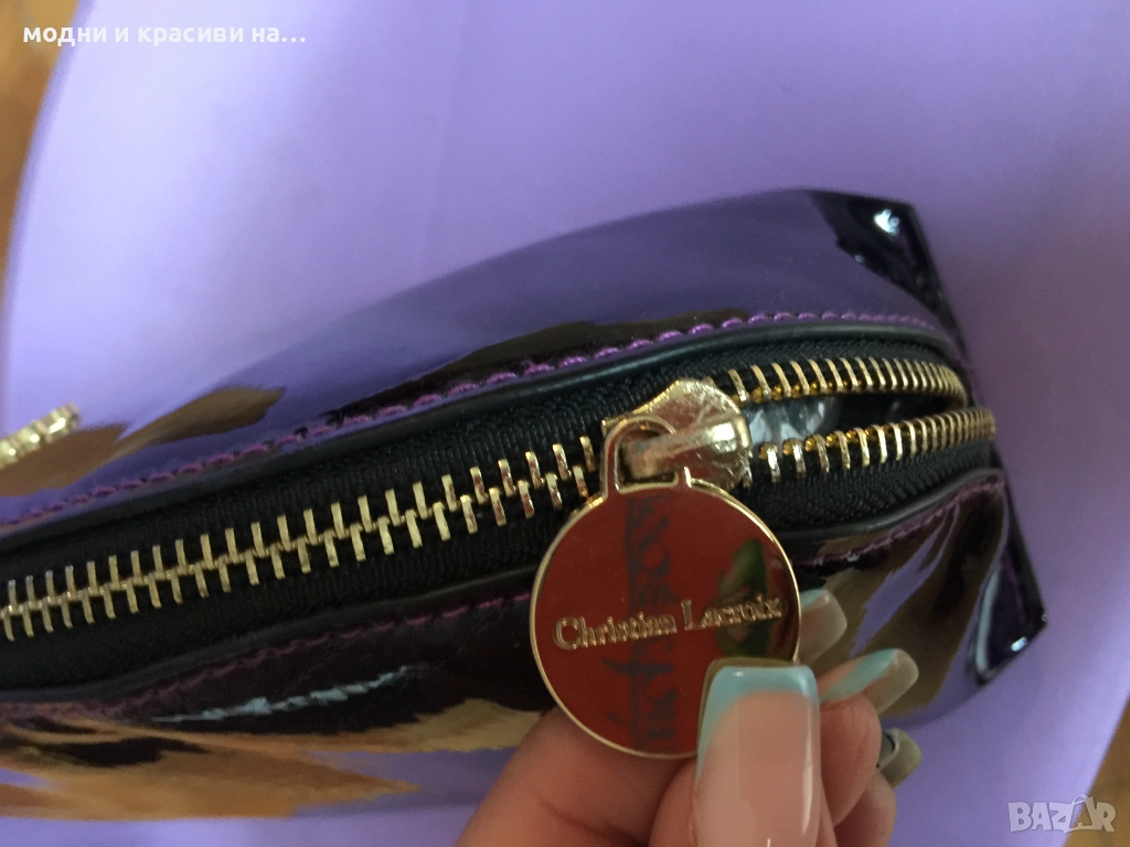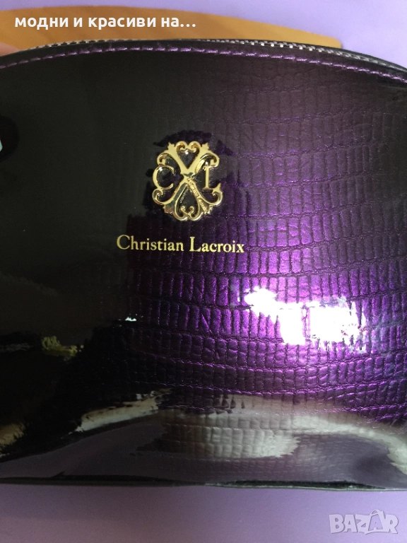 Вторият несесер е на Christian Lacroix. В наситен цвят “purple”. Материята отвън е полиуретан и придава много красиви отблясъци на този пурпурен цвят. Несесрът е с със сериен номер, с лого отпред и лого на ципа.