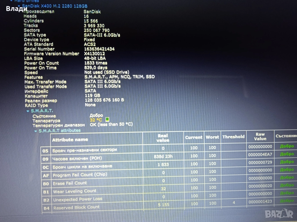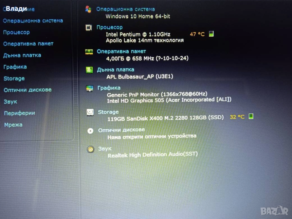 Инсталиран с Windows 64 bit ,HDD Sentinel,Speccy и Aida 64,за да се тества преди да се плати.