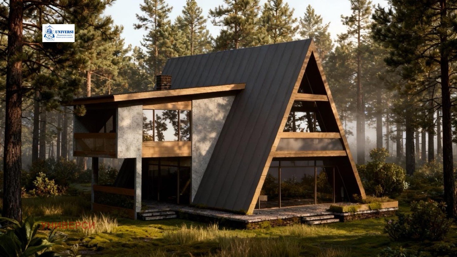 Характерното за A frame конструкцията са високите тавани (2,80м) и голямото остъкляване, което прави стаите изключително светли. Поради наличието на емпоре над дневната височината на помещението е над 5 метра.