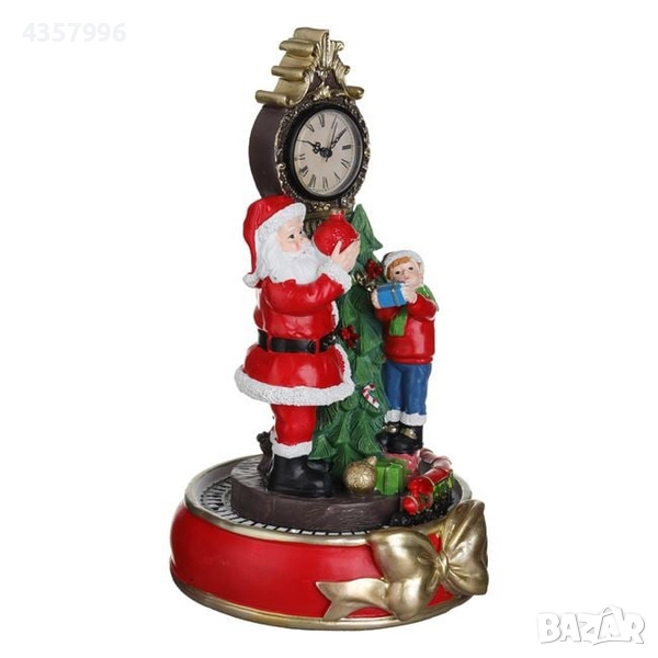Коледна декоративен часовник, фигурка на Дядо Коледа с дете, върху червена основа с влакче.