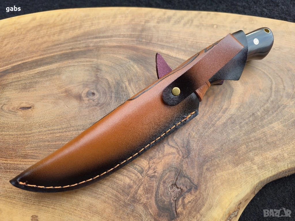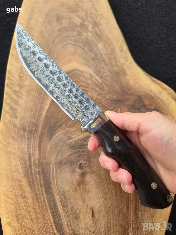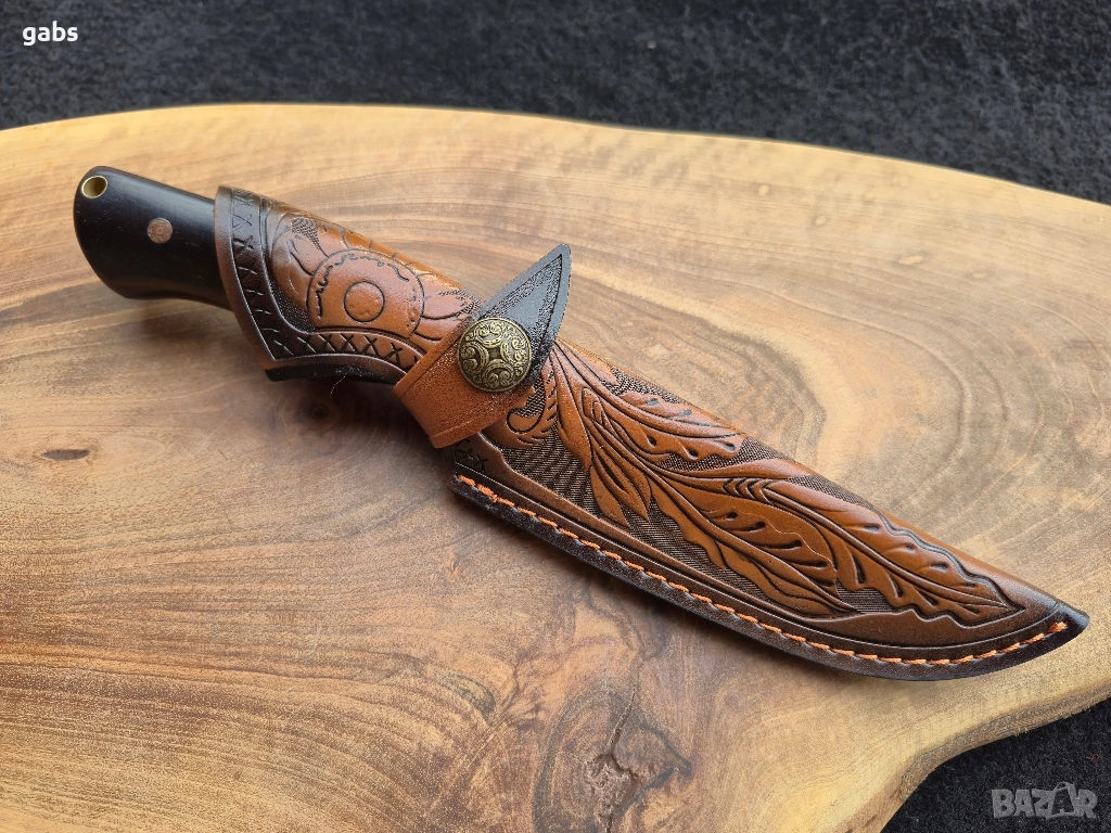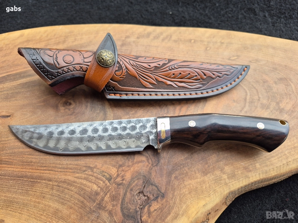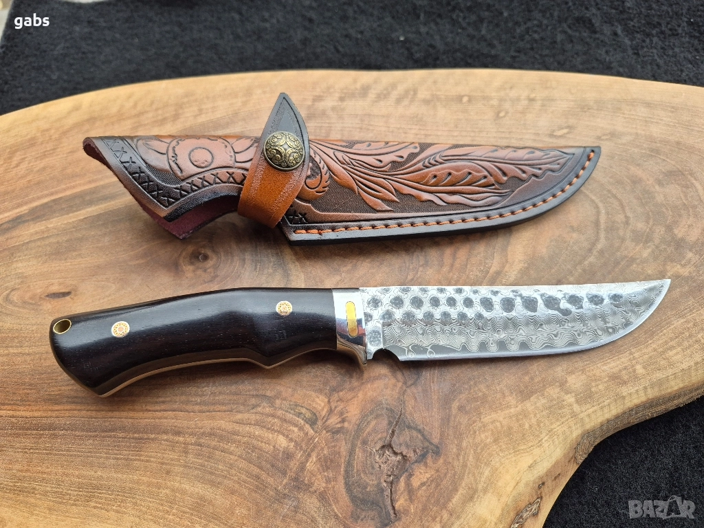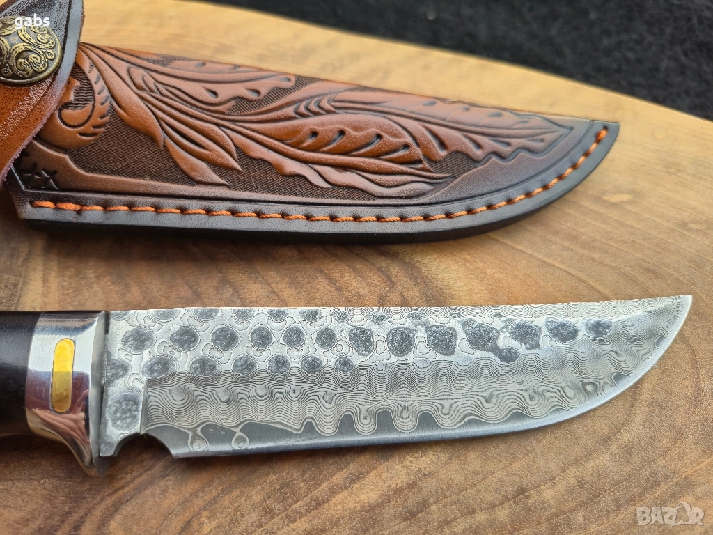 нож, изработен от дамаска стомана. Той притежава наистина впечатляващ и стилен дизайн. Този нож е изключително надежден и здрав, което го прави перфектен за всякакви нужди. В допълнение, той идва в комплект с елегантна кожена кания. Този ловен нож е идеалният спътник за всеки ценител.