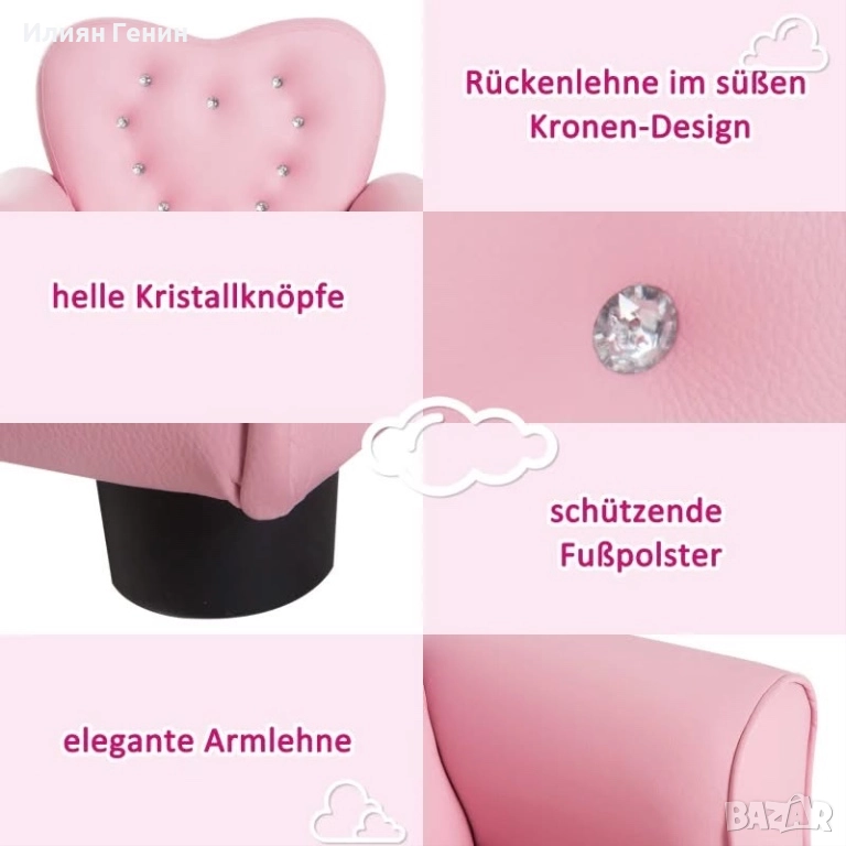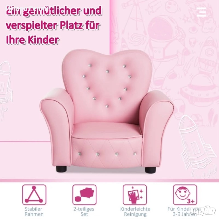 Кралски дизайн: Облегалката на розовия фотьойл и декоративният кант са бродирани с красиви кристални копчета. Точно това, от което се нуждаят малките принцеси.