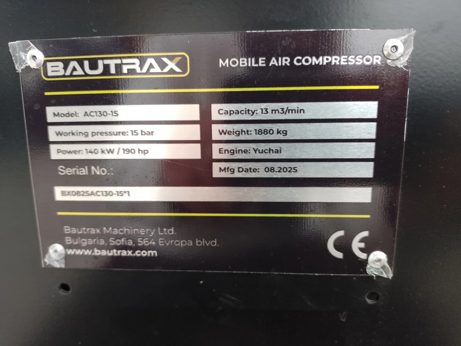 ЧИСТО НОВ ДИЗЕЛОВ КОМПРЕСОР 13 м3/15 бара ! ! ! Една година или 1000 мч ГАРАНЦИЯ ! Следгаранционно обслужване ! Марка / Модел: Bautrax AC130-15 Технически данни: -Производителност при нормално работно налягане 460 cfm (13 m³ /min) -Нормално работно налягане 15 bar -Минимално / максимално разтоварно налягане 4. 5 / 16. 8 bar -Степени на компресия 1 -Обем на ресивъра 43 L -Обем на маслото в компресора 30 L -Температура на изходящия въздух Около +65 C (стандарт) -Типично съдържание на масло във въздуха < 5 mg/m³ -Капацитет на резервоара за гориво 180 L -Изходна конфигурация на клапаните 1 x G3/4 ; 1 x G1 1/2 -Номинални работни условия Входно налягане 1 bar, влажност 0%, температура 20 C -Ниво на шум (ISO2125) 83 dB(A) 3 -Макс. околна температура на морско равнище 50 C -Максимална надморска височина 2000 m -Минимална температура за старт -10 C / -25 C (с комплект за студен старт) -Модел на двигателя Yuchai YCA05190-T300 -Мощност при номинални обороти 140 kW -Цилиндри 4 -Охладителна система Смазочна -Работен обем на двигателя 4. 837 L -Обороти без товар / максимални обороти под товар 1500 / 2000 RPM -Стандартна скорост на теглене 20 km/h -Размери (Д× Ш× В) с шаси 3509 × 1790 × 1866 mm -Тегло (с масла, охладител и гориво) 1880 kg