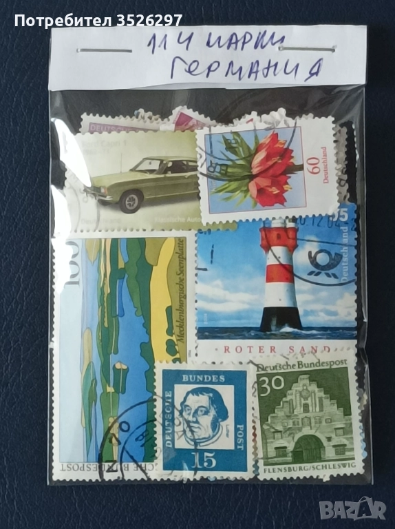 Колекция от 114 пощенски марки от Германия 0т 1946 година до наши дни. Марките са с печати и са тези от снимките за цена от 6 евро..
