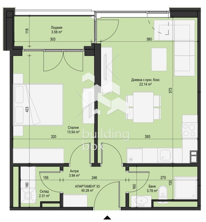 Имотът е с много добро разпределение, със застроена площ от 60.28 кв.м. Състои се от дневна с кухненски бокс, спалня, баня с тоалетна, лоджия, склад и антре. Изложението на апартамента е западно. Сградата ще се отоплява на ток с монтирана термопомпа.