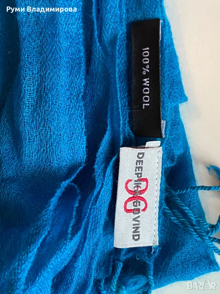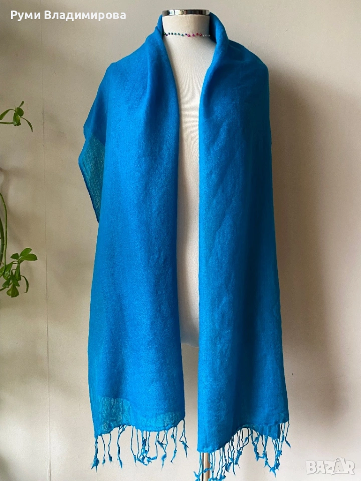 Тюркоазено Син шал от 100 % вълна, дузайнерски шал на Индийската дизайнерка Deepika Govind, ръчно оцветен, дълъг шал, с ресни, прозираща, рехава материя, нов, доставка с Еконт.