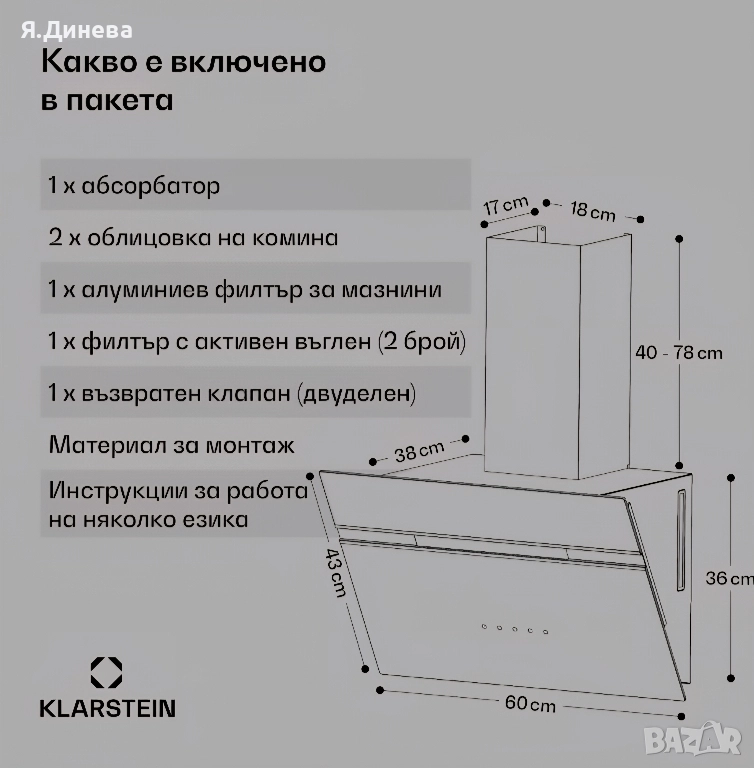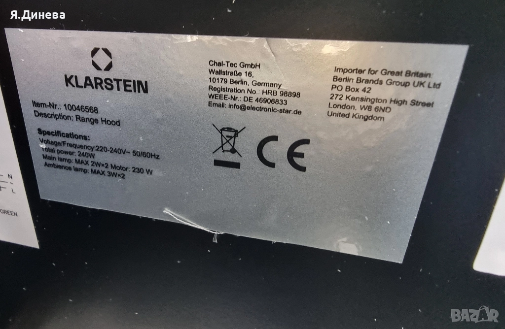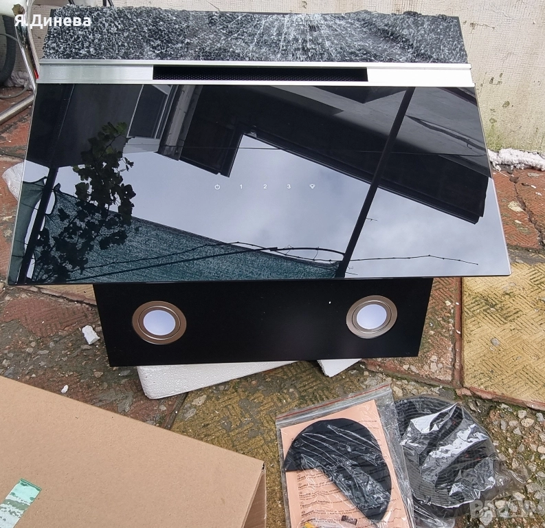 Продавам чисто нов абсорбатор Klarstein 230w,тестван и работещ. Както се вижда на снимките горната част на стъклото е натрушено при транспорта. Но това не му пречи да си работи нормално, има 3 степени на изсмукване. Има и както отпред така и отстрани лампи. Внос от Германия.
