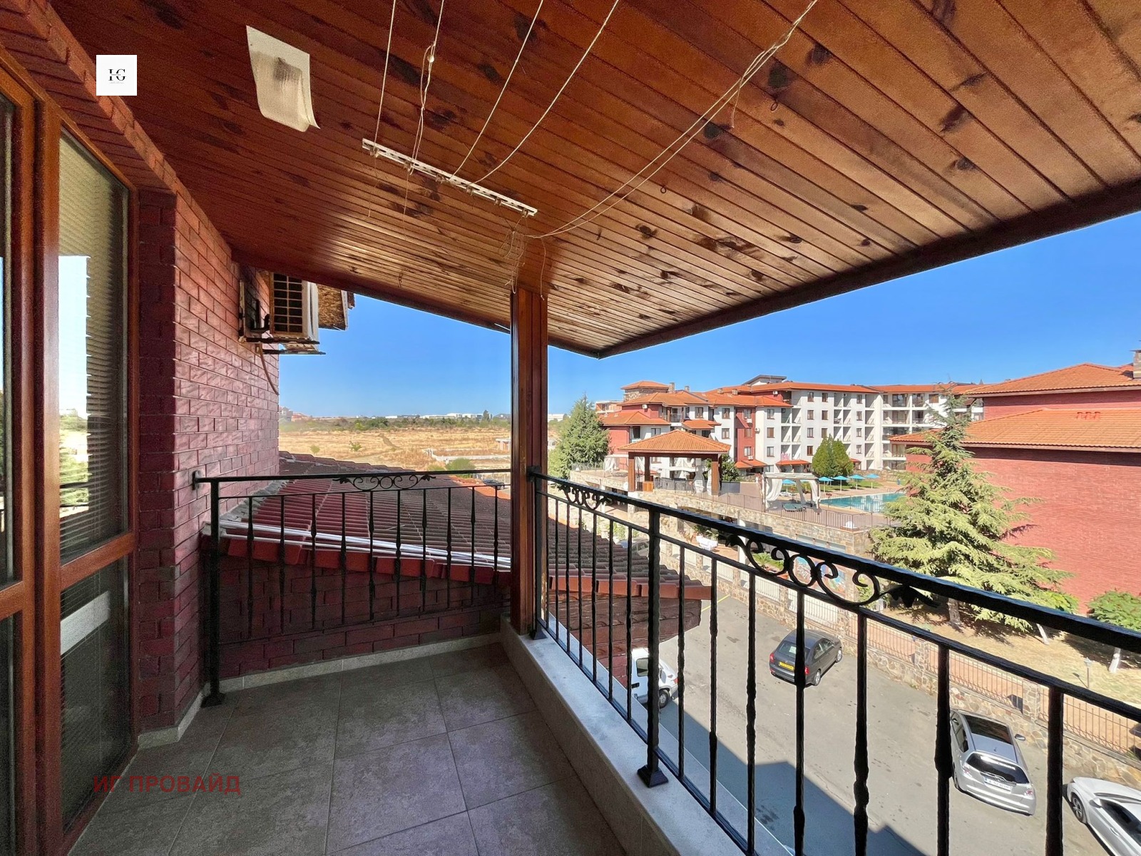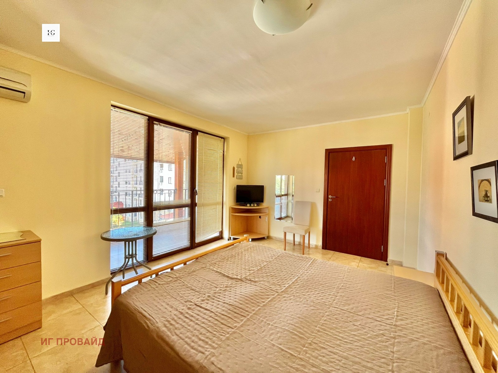 Имотът е напълно обзаведен, оборудван и готов за незабавно нанасяне. Разпределението включва входно антре, голям хол с кухня и трапезария, три самостоятелни спални, два санитарни възела и два балкона с гледка към вътрешния двор. Комплексът разполага с богата зелена зона, контрол на достъпа и три басейна, като се намира в тиха локация, близо до плаж, магазини и удобства. Отлично предложение за семейство, търсещо комфорт, пространство и сигурност.