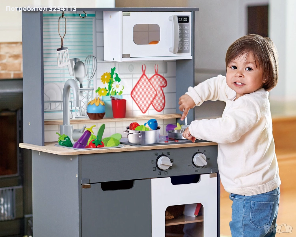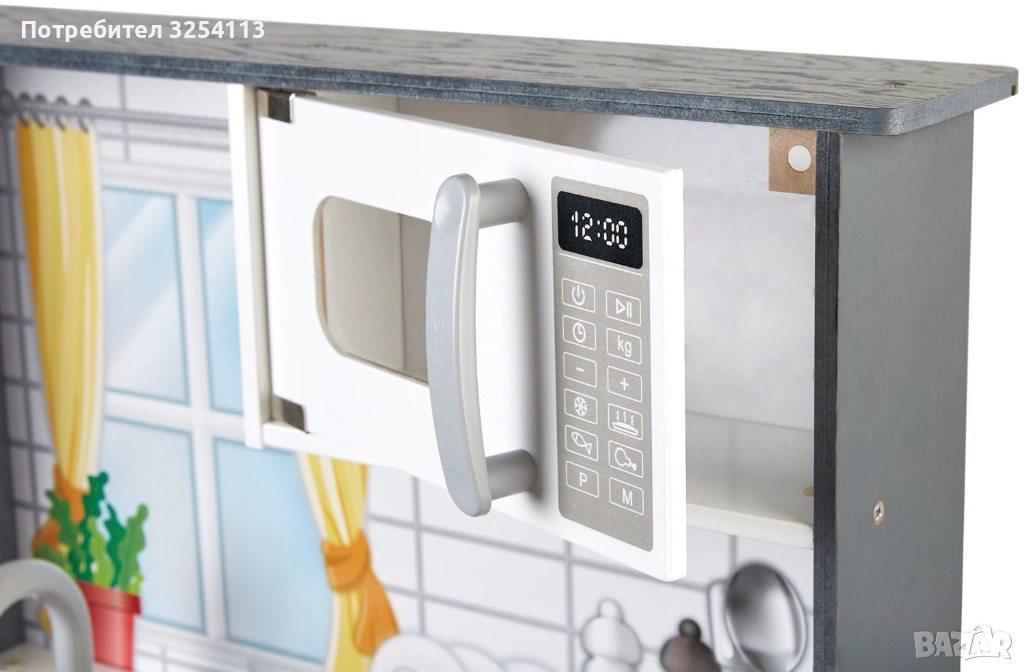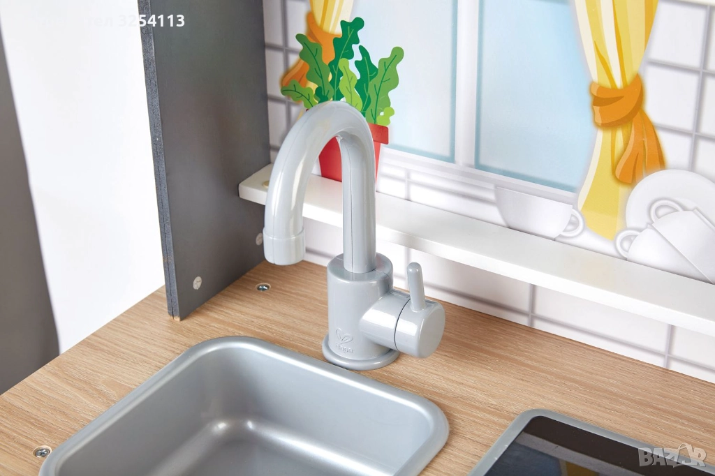 Кухнята е боядисана в свеж цвят, подходящ както за момиченца, така и за момченца. Оборудвана е с 2 котлона, фурна, микровълнова печка и мивка. Има още шкаф и рафт за аксесоари. Задната част зад мивката е декорирана така, че да пресъздава истинска обстановка в дома и да запали още повече въображението на децата. За да включите котлоните, натиснете някое от копчетата и вижте как те ще светнат и ще издават звуци сякаш в тях се пържи нещо. За да е още по-автентична играта, в комплекта са включени тиган и шпатула.