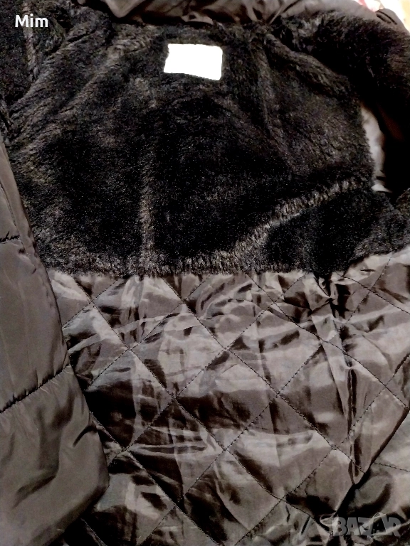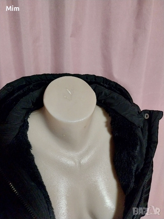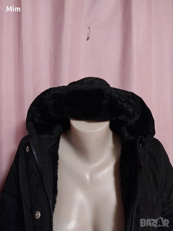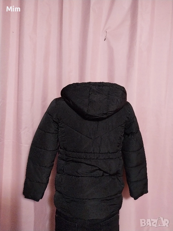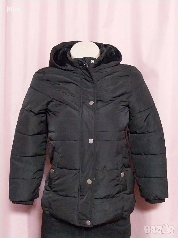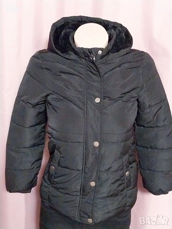 Черна зимна шуба за момиче закопчаването е отпред с цип и копчета тик так с два джоба закопчаването е с копче тик так с качулка с черен пух с дебела подплата .размера в см е на снимките. Няма никакви забележки.