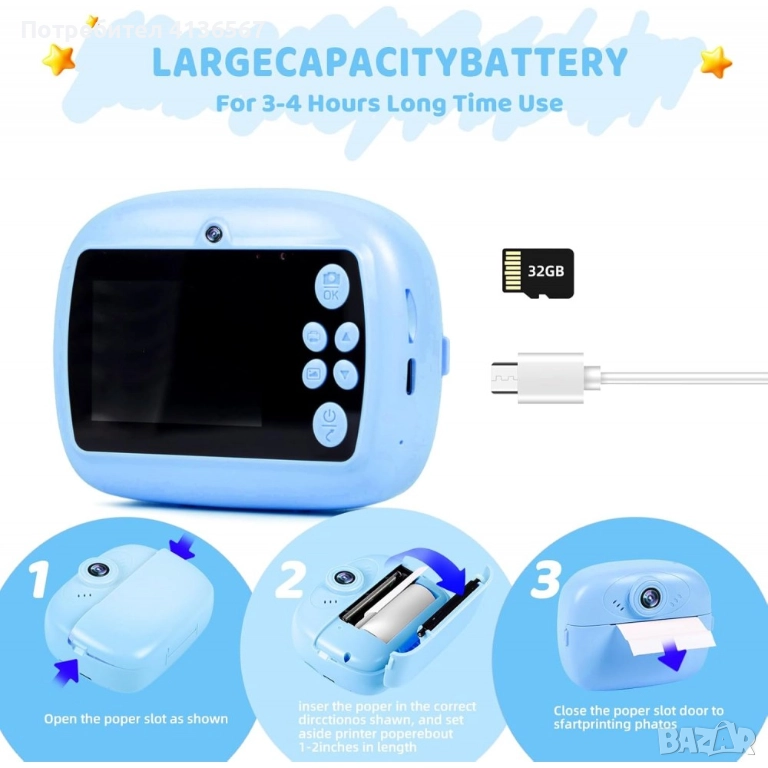 Този забавен и лесен за използване детски фотоапарат с моментално принтиране е идеален подарък за малки фотографи. С ярък картинен дизайн, двоен обектив и възможност за незабавно разпечатване, устройството съчетава игра с креативност и вдъхновение.
