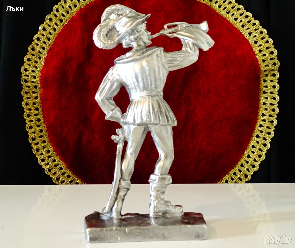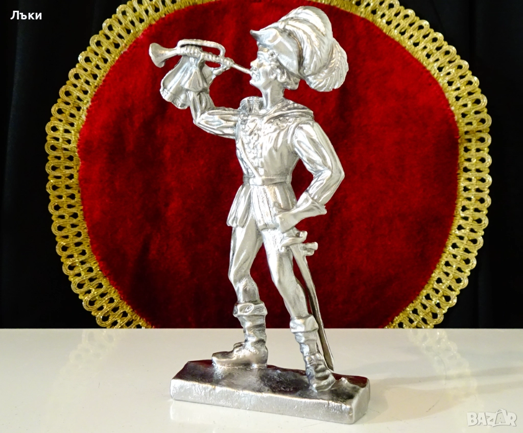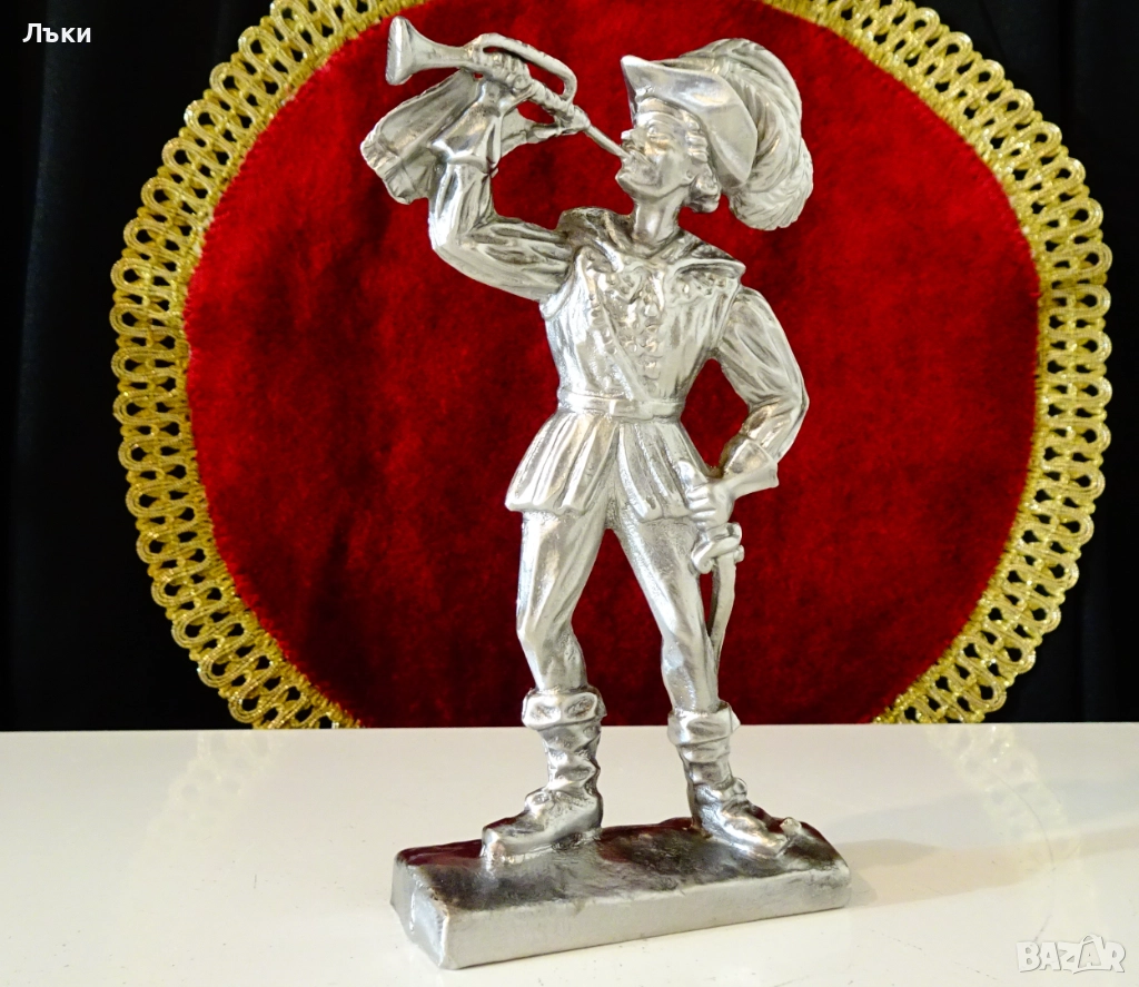 Стара калаена статуетка,фигура на ловец със сабя и ловен рог