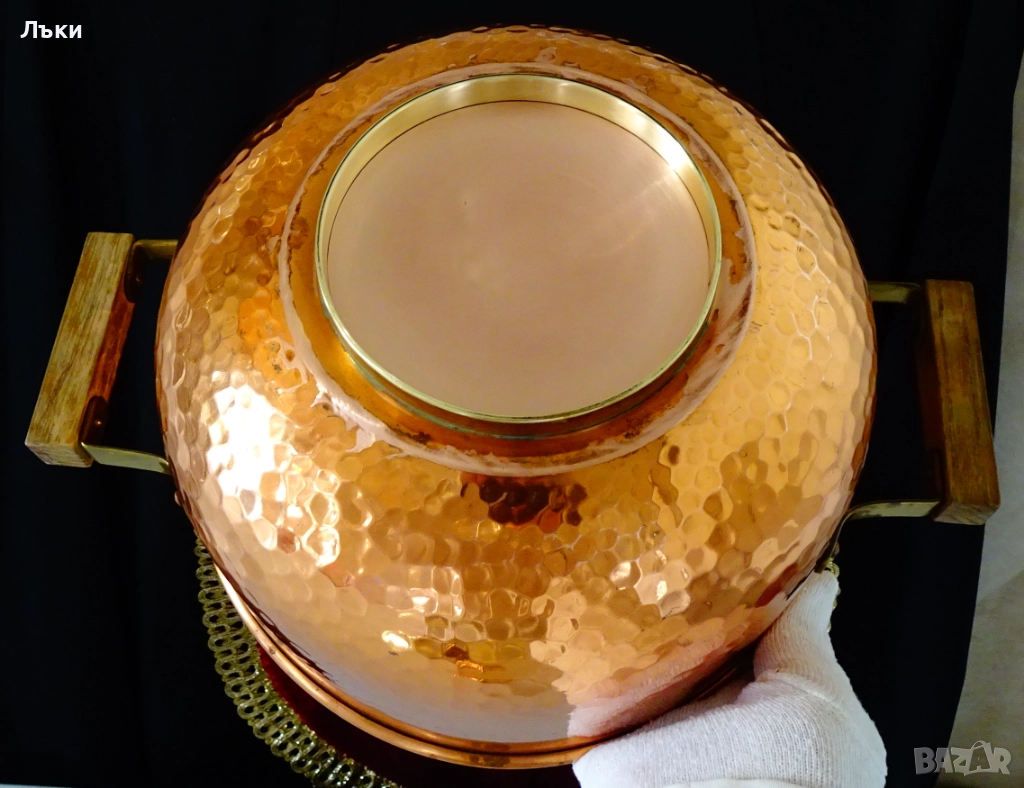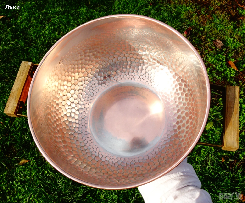 с масивни медни нитове.Ръкохватките са от плътно естестевно дърво.От вън,дъното