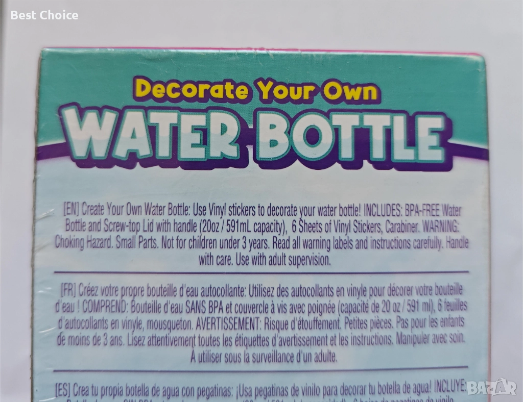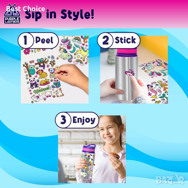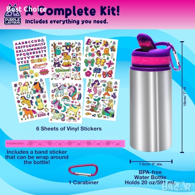 Комплект за декорация на собствена бутилка за вода от неръждаема стомана, произведен от Purple Ladybug. - Бутилката е изработена от материали без BPA (Бисфенол А) и е тествана за безопасност.