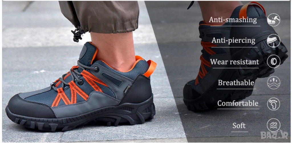 - Подметка: Междинна подметка от кевлар + гумена подметка; подметката е не само лека и устойчива на износване, но също така има функцията да предотвратява пробиване на остри предмети, а също така осигурява удобно омекотяване, за да намали умората на краката.
