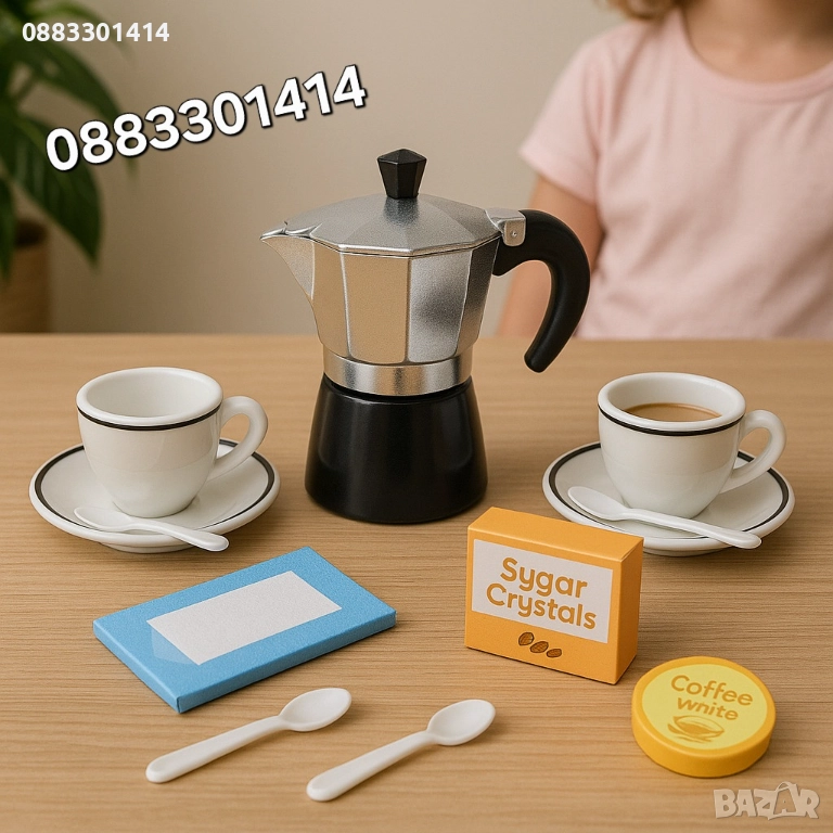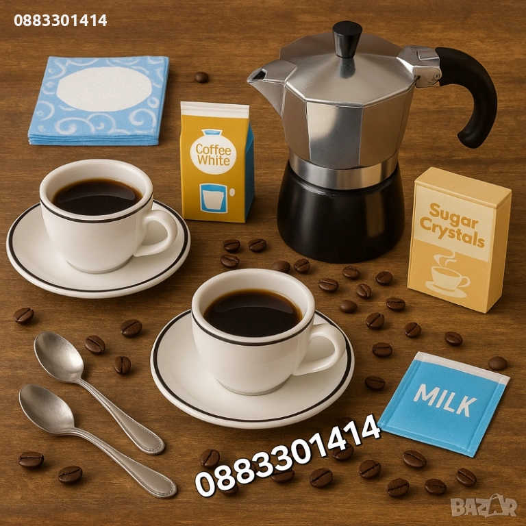 Комплектът съдържа: Кафеварка, две чашки, две чинийки, две лъжички, пакетче със салфетки, макети на пакетче захар и течна сметана за кафе.