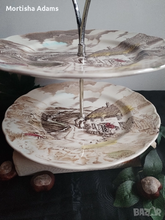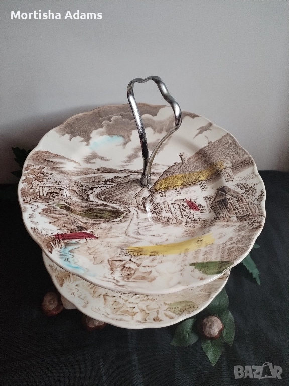 Прекрасен винтидж поднос на две нива, височина с дръжката- 23,5см., диаметър и на двете плата 25см. Здрав, две- три драскотинки и леко напукване на гланца на едната чиния, и частично захабяване на дръжката отвътре.