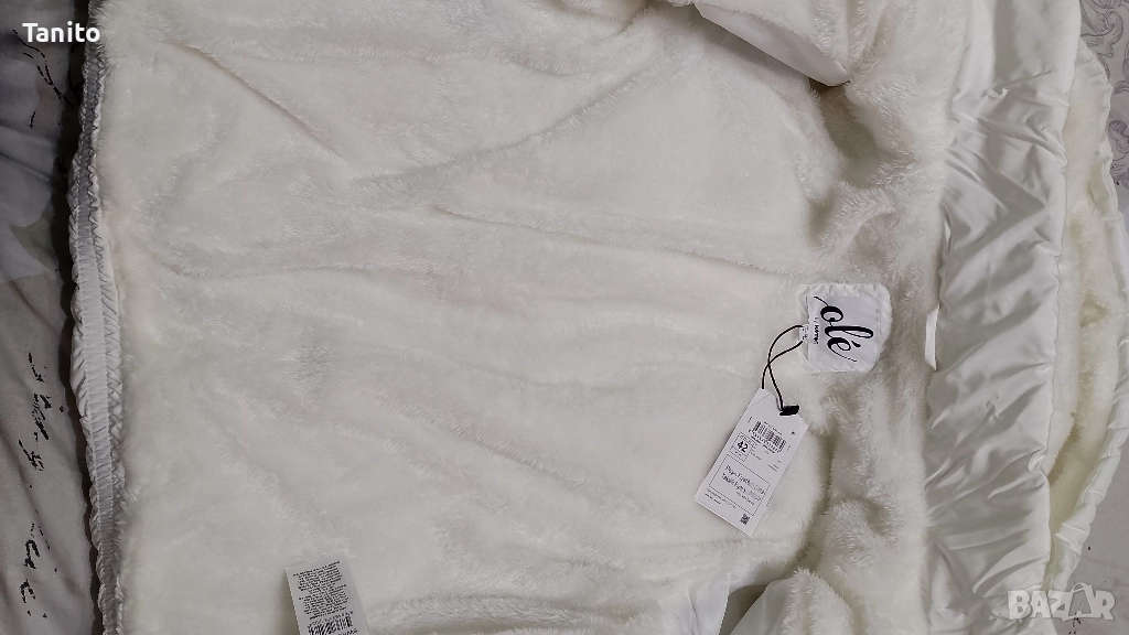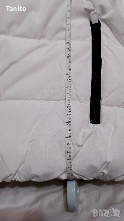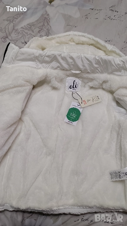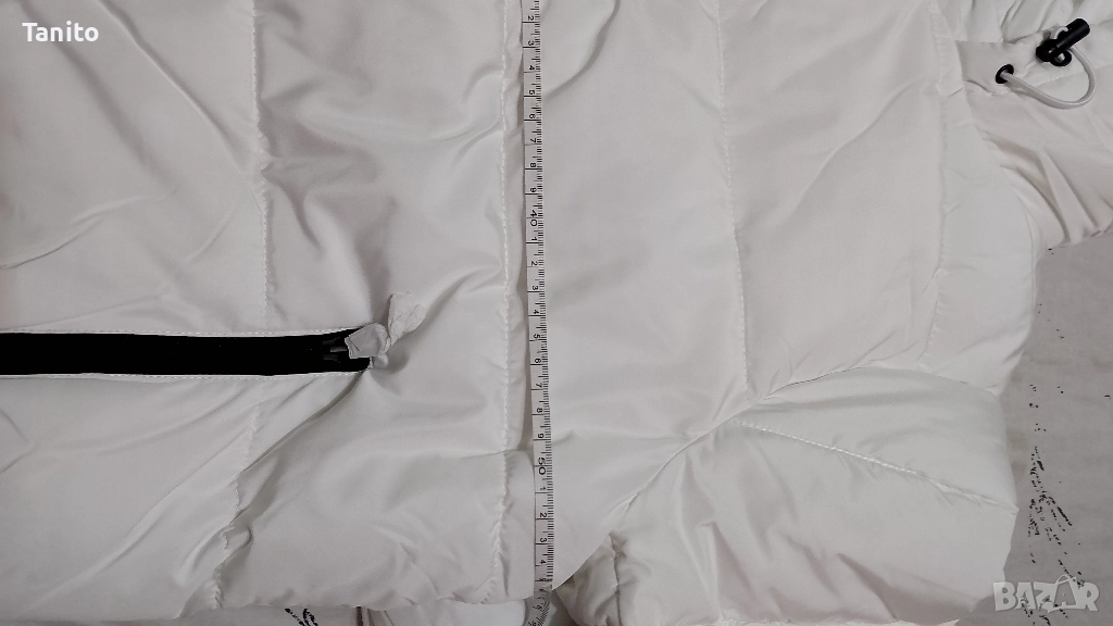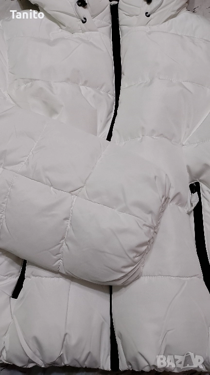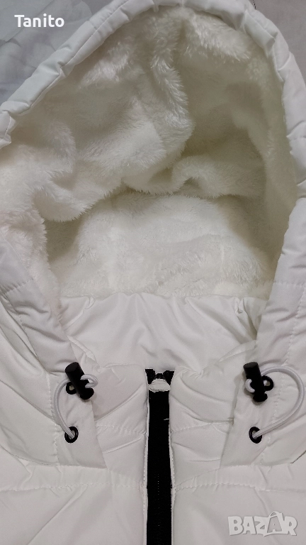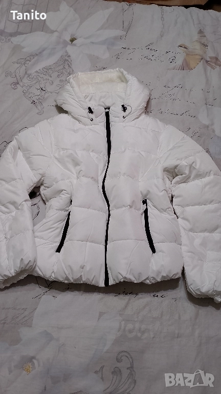 Чисто ново дамско зимно яке в бял цвят,размер 42. Стилно и топло за студените дни.Има мека пухена подплата отвътре и на качулката.Качулката не се сваля.Подробните размери са на снимките.