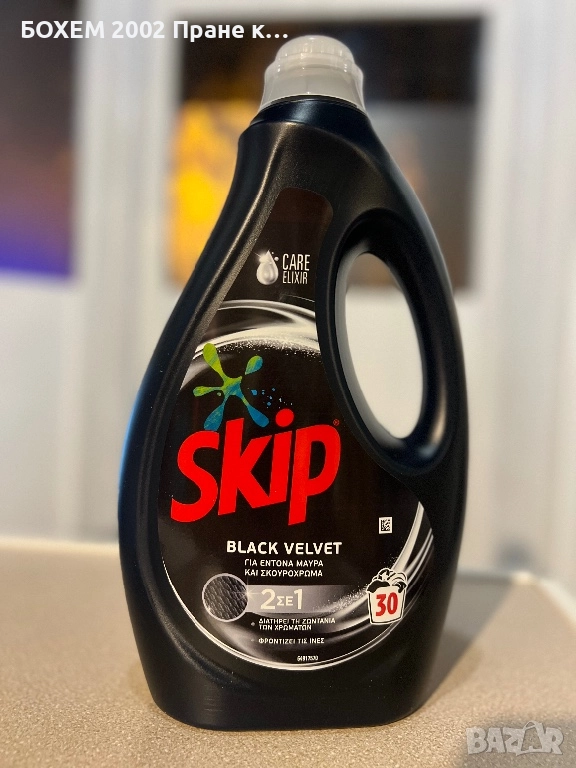 Продавам Skip Black Velvet 2в1 – специализиран течен перилен препарат за черни и тъмни дрехи.