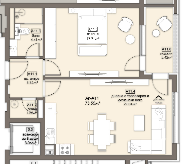 Просторен светъл и уютен двустаен апартамент, отговарящ на всички изисквания за един съвременен дом. Апартамент А11 на схемата. Удобно и функционално разпределение, големи, комфортни и светли помещения. Чиста площ 75,55кв.м., площ с общи части 86,99кв.м. Възможност за пълноценно и безкомпромисно обзавеждане на всички помещения. Изложение изток.