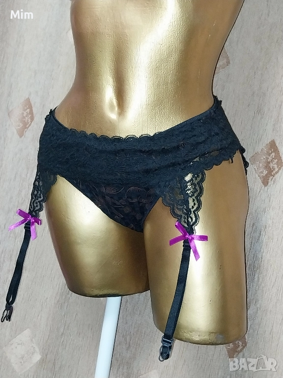 Черен еластичен, дантелен колан в талията от 70 до 100 см еластичност, дължина 7 см с 4 жартиери за чорапи, отпред с цикламови панделки ,бикината е в отделна обява. Няма забележки.