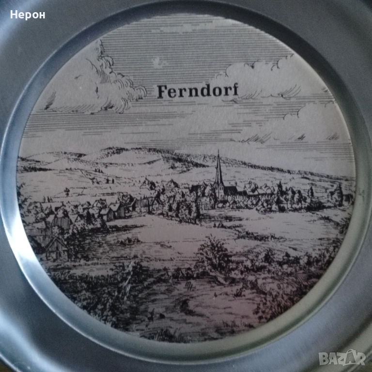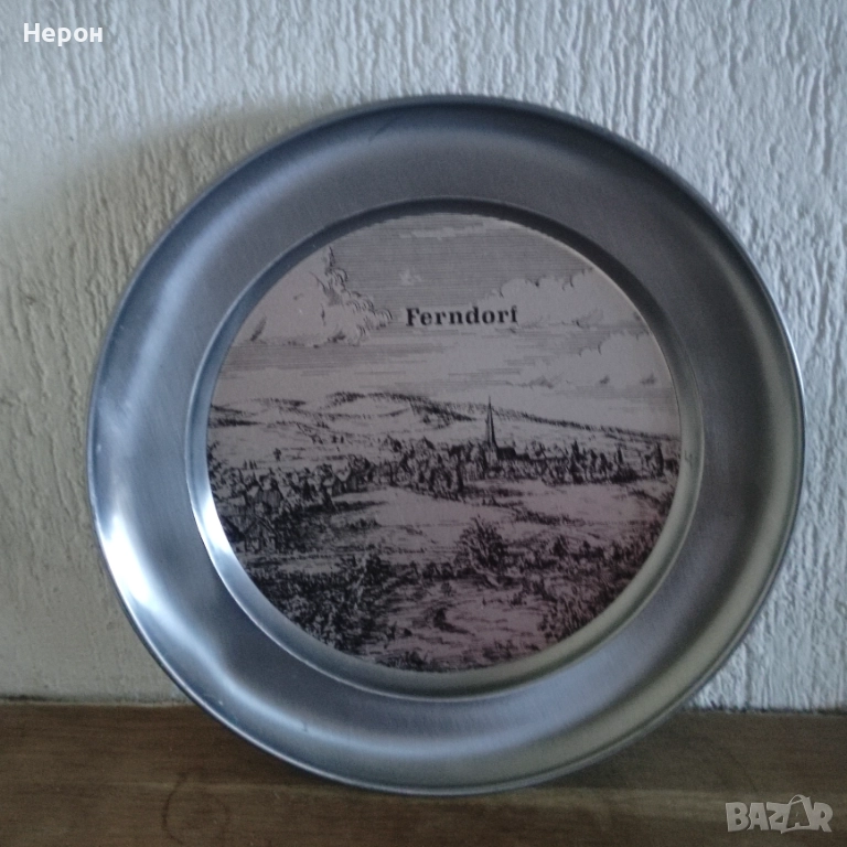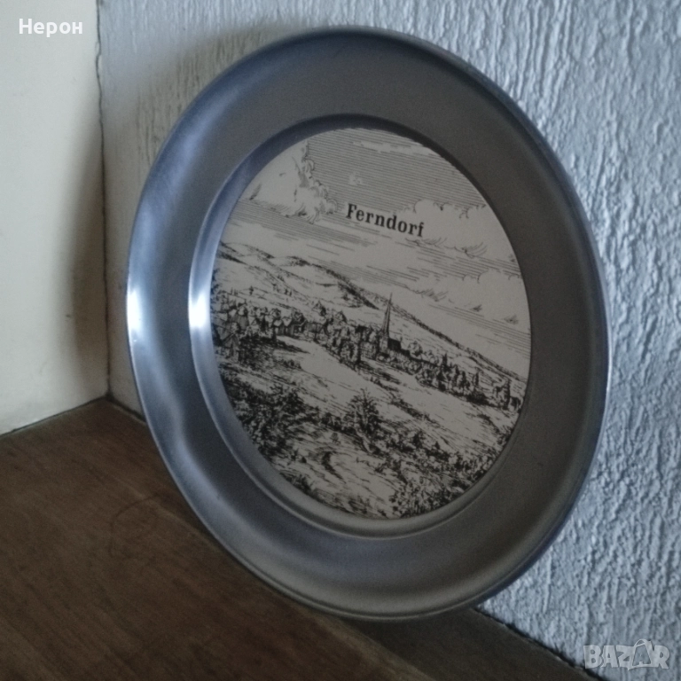 Винтидж калаена чиния за стена с изображение на гр. Ferhdorf- Германия, отлична, маркирана,диаметър-22.7 см, тегло-530 гр. По Еконт с 10% отстъпка.