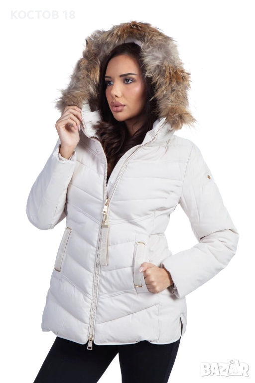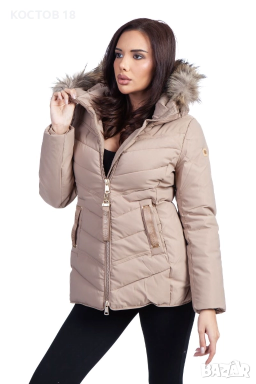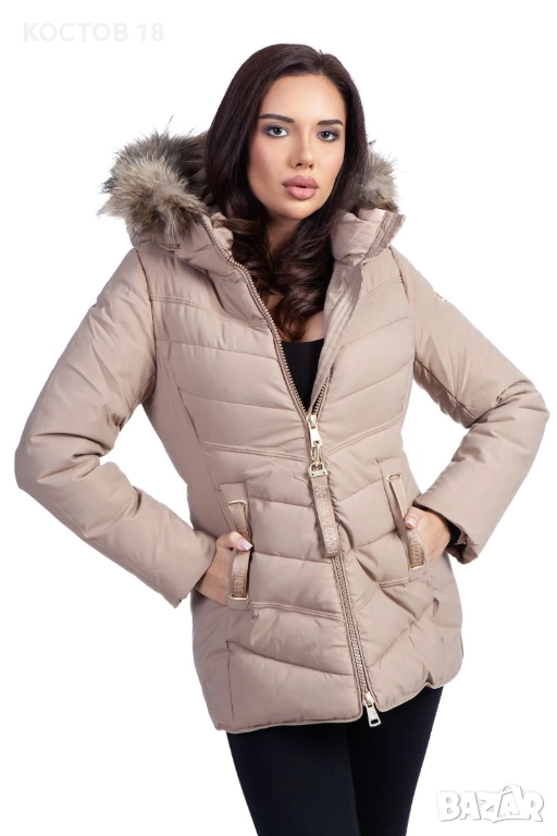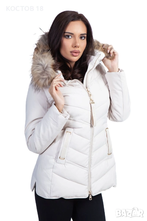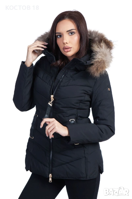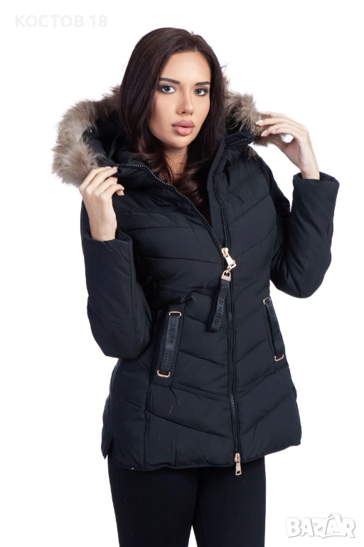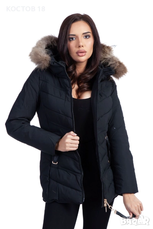 Зимно дамко яке яке с качулка, на която има естествен косъм (лисица). Пухът от качулката се сваля, но качулката не се сваля. Якето е със средна дължина, подплатено със силиконова (пресовна) вата и шушлякова подплата. Има два странични джоба с цип. Изработено от 100% полиестер. Подходящо за сезон есен/зима.