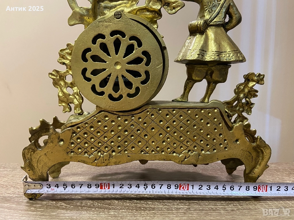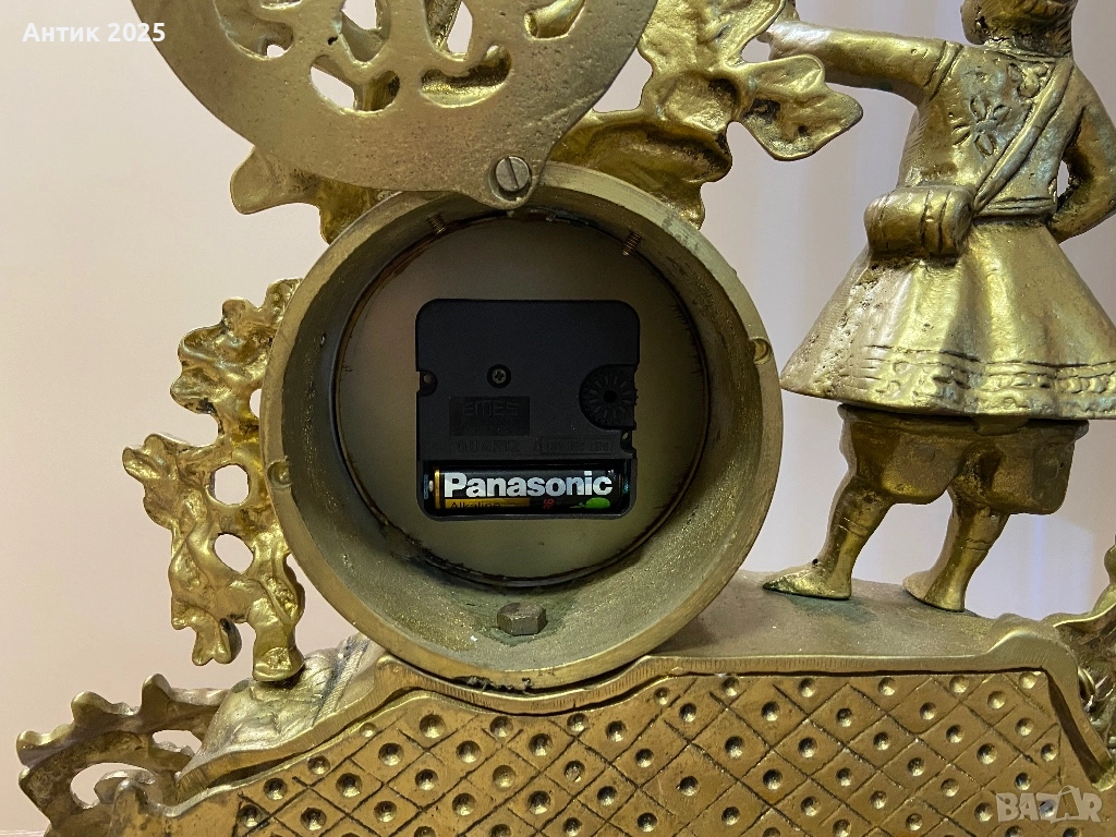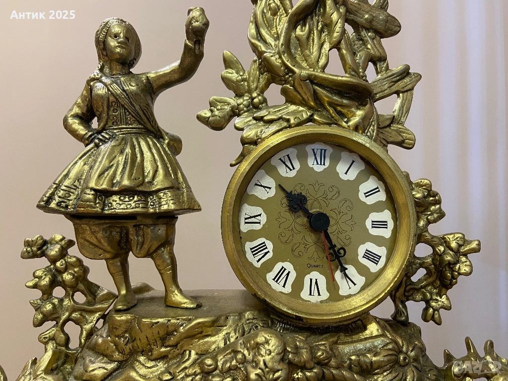 Декоративен винтидж часовник от бронз, изработен в класически стил с богати ажурни орнаменти. Горната част е украсена с фигура на момиче и растителни мотиви, което придава на часовника допълнителен чар и колекционерска стойност. Корпусът е масивен, с красива винтидж патина. Часовникът е с кварцов механизъм и е необходимо да се смени батерията. Подходящ за интериора на хол, кабинет или камина, както и като оригинален подарък или колекционерски предмет.