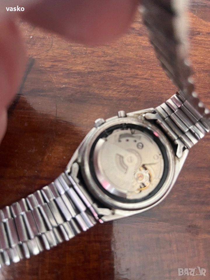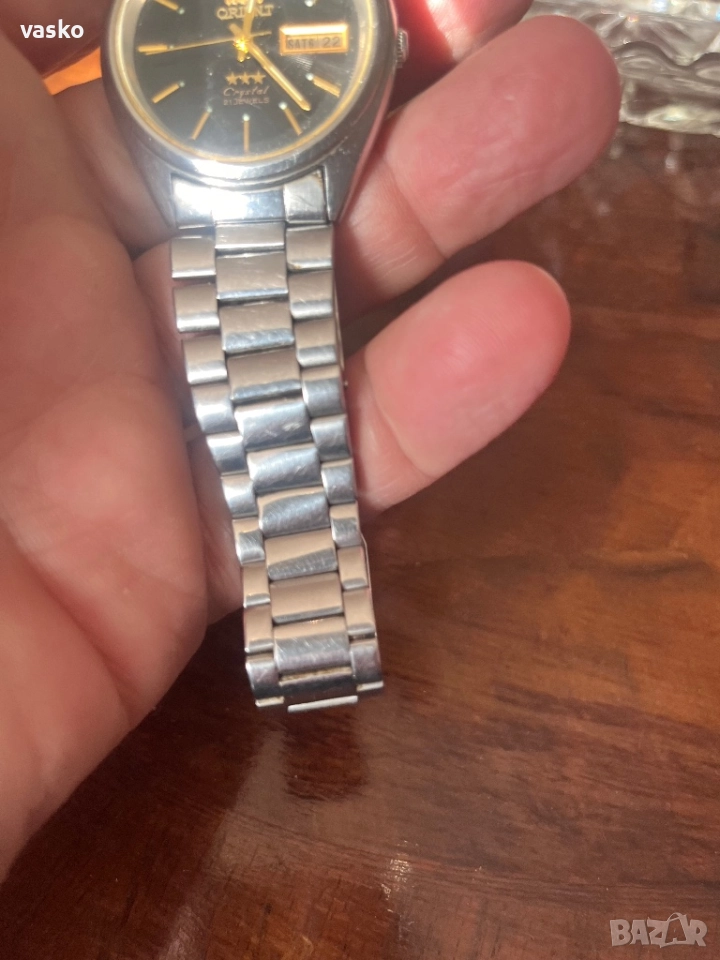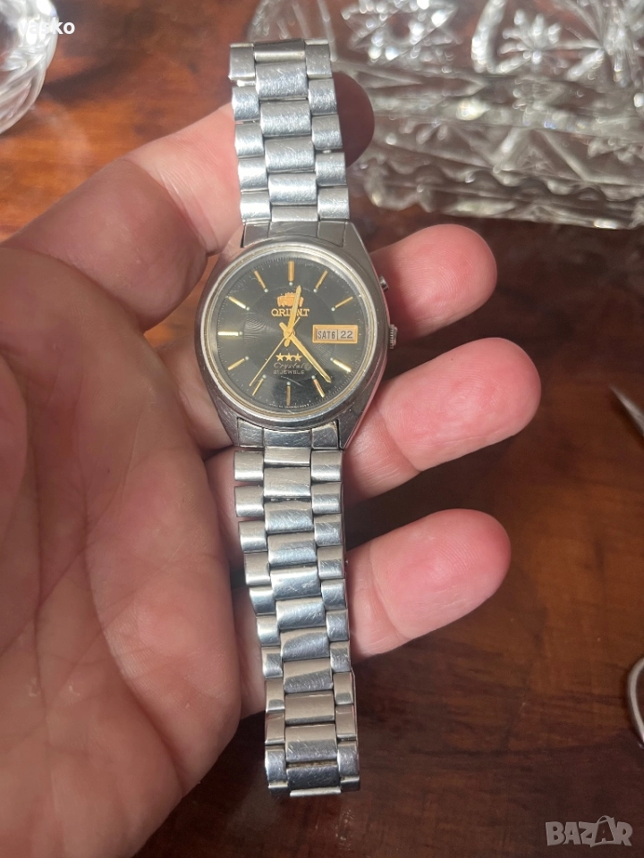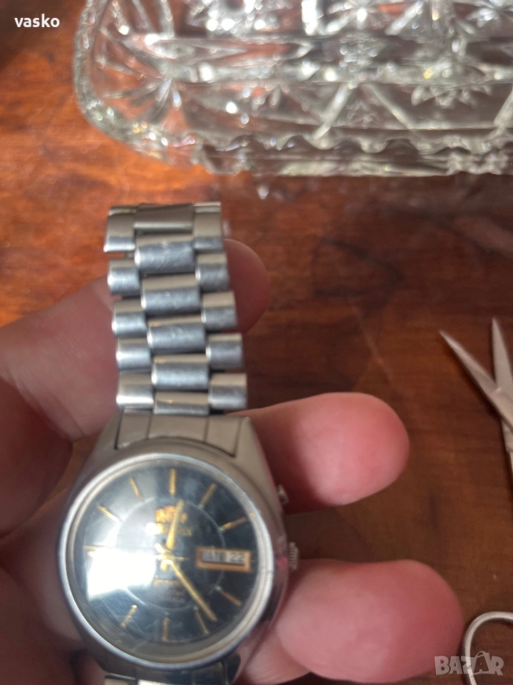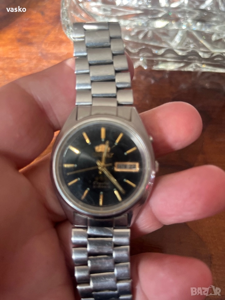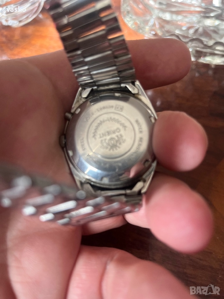 Стар Японски Ориент,работи,брандирана оригинална машина,около 37мм диаметър-измерен със линийка,има няколко драскотини на стъклото-видими под определен ъгъл,всичко му работи,не знам колко точно,оригинална верижка-за китка около 19см,черен циферблат.