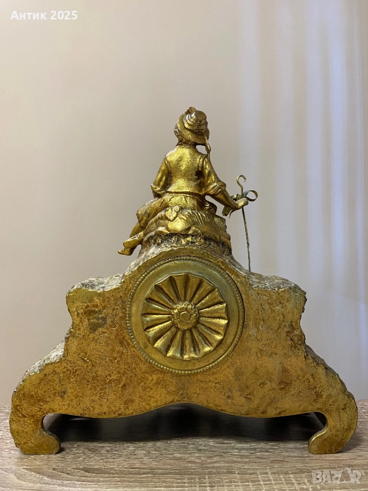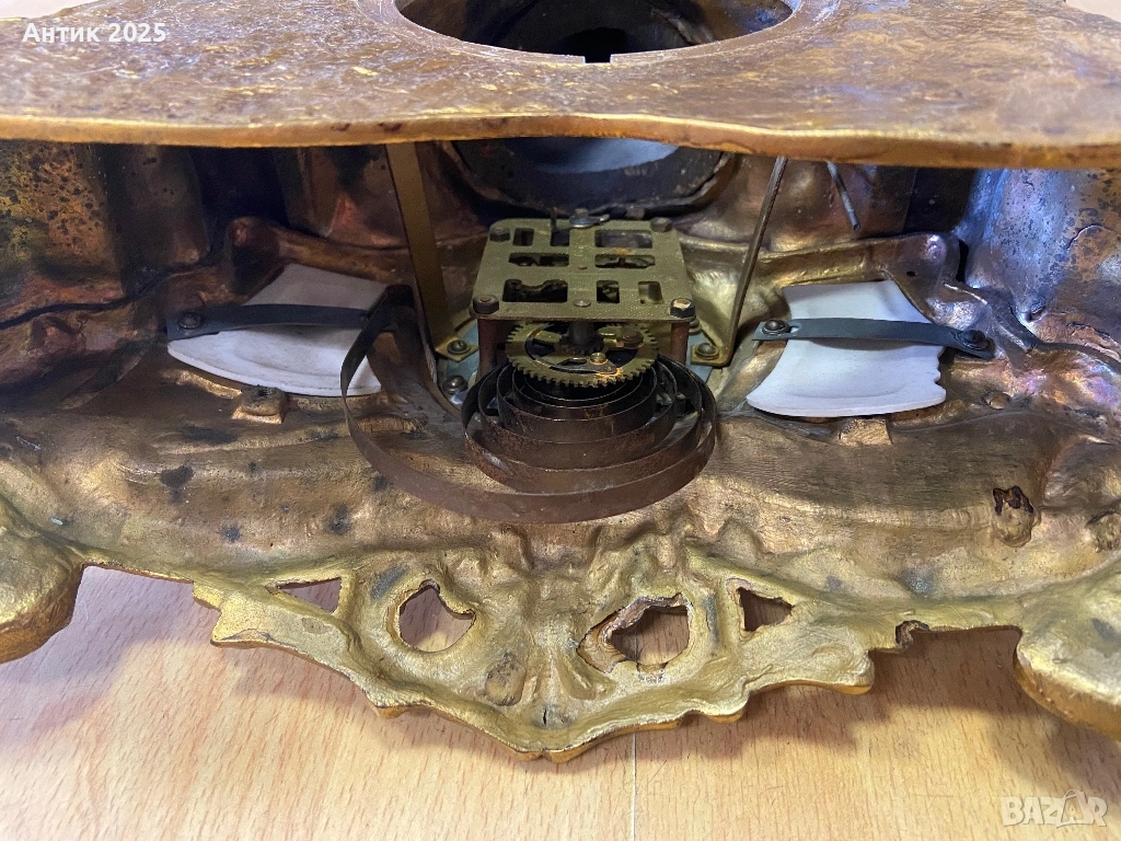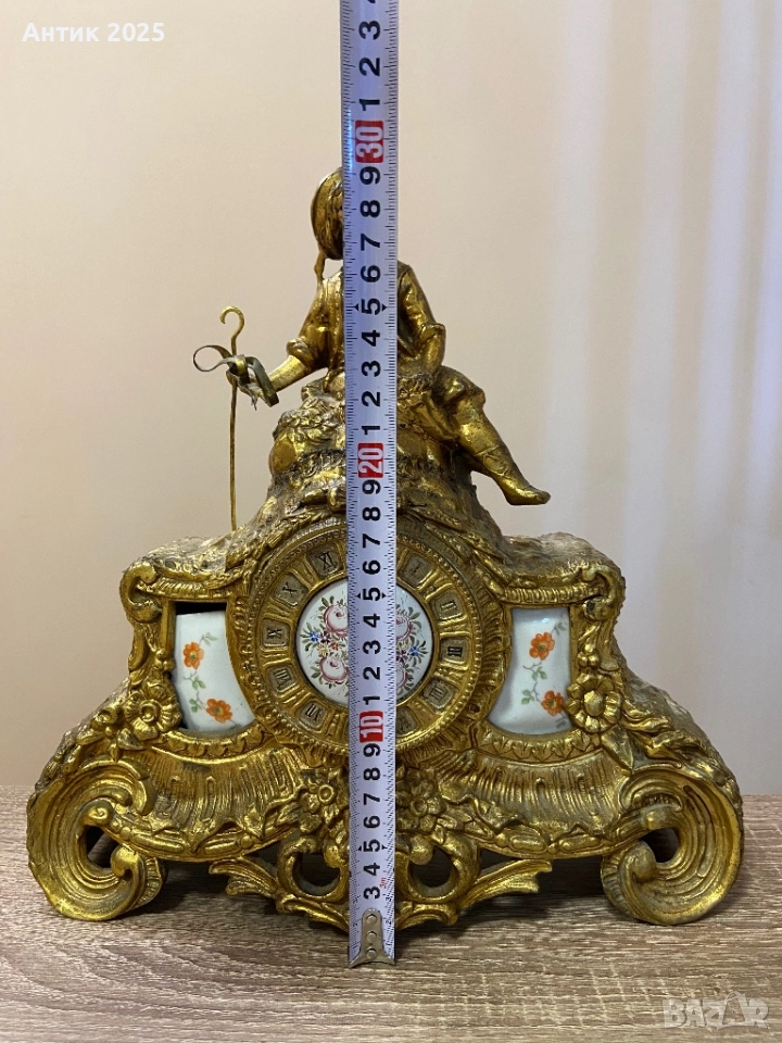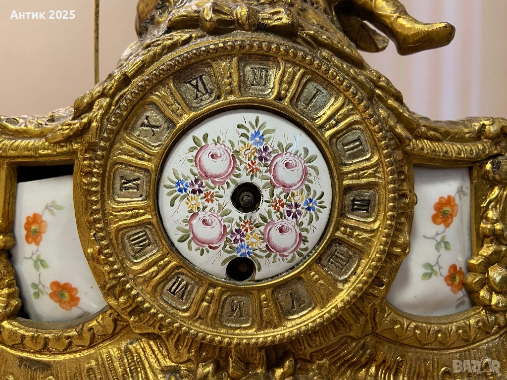 Античен настолен часовник от бронзa с изящна фигура на девойка в горната част и богато декориран корпус в стил късен XIX – началo на XX век. Отстрани има порцеланови вложки с ръчно рисувани цветя, а циферблатът е украсен с нежен букет и римски цифри.