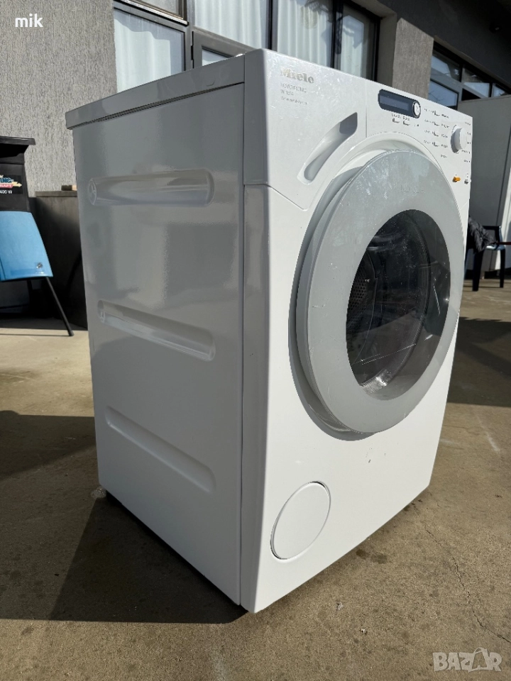 Пералня Миеле модел Новотроник 1514. Сив люк. Размери 85-60-60. За 7 кг пране. Произведена в Германия за немския пазар. С ел. дисплей за настройване на програмата. Казан - неръждаема стомана. Леска за работа. Голям отвор за по-удобно слагане и вадене на прането . Оборудвана с маркучи. Готова за употреба.