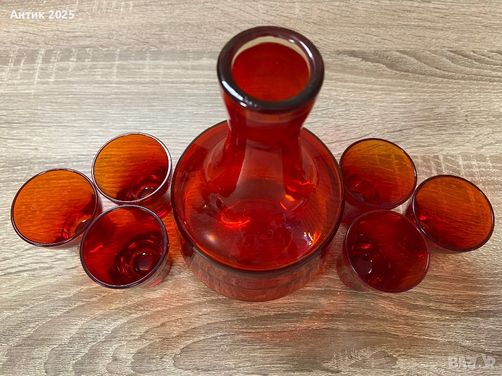 Елегантен комплект от плътно рубиново стъкло, изработен в класически стил. Включва обемна гарафа и шест чаши. Стъклото е оцветено в масата, с наситен червен цвят и красива игра на светлината.