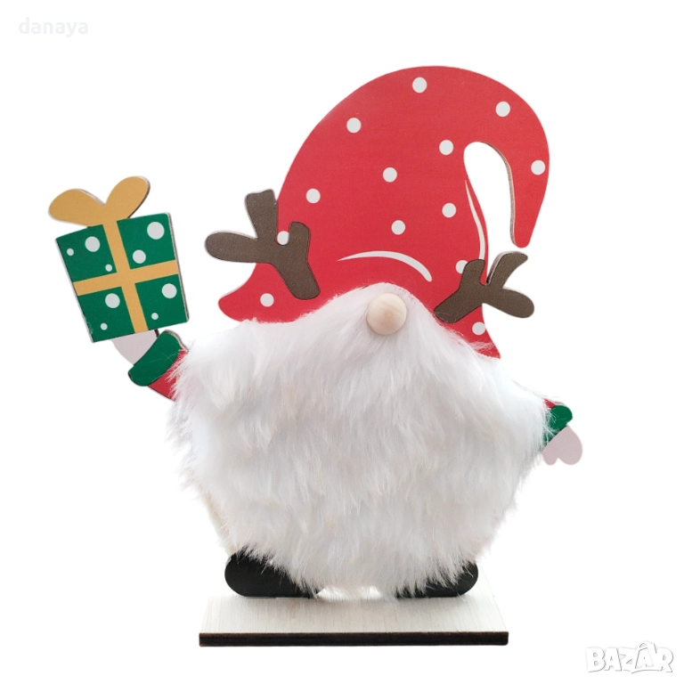 6127 Коледна украса джудже с пухкава брада и подарък, MDF
