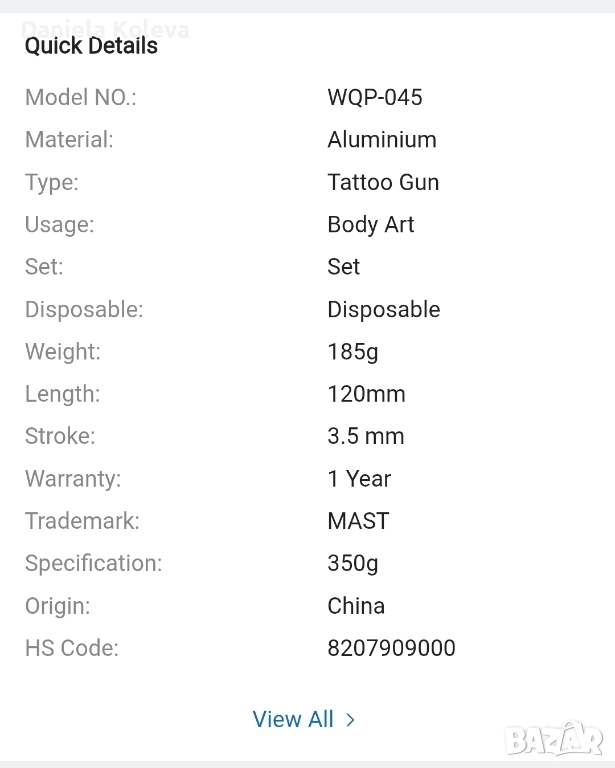 Съвместима с всички видове игли. №: WQP-045 Материал: Алуминий Тип: Тату машина Употреба: Боди арт Комплект: Комплект Тегло: 185 г Дължина: 120 мм Ход: 3.5 мм Търговска марка: MAST Спецификация: 350 г