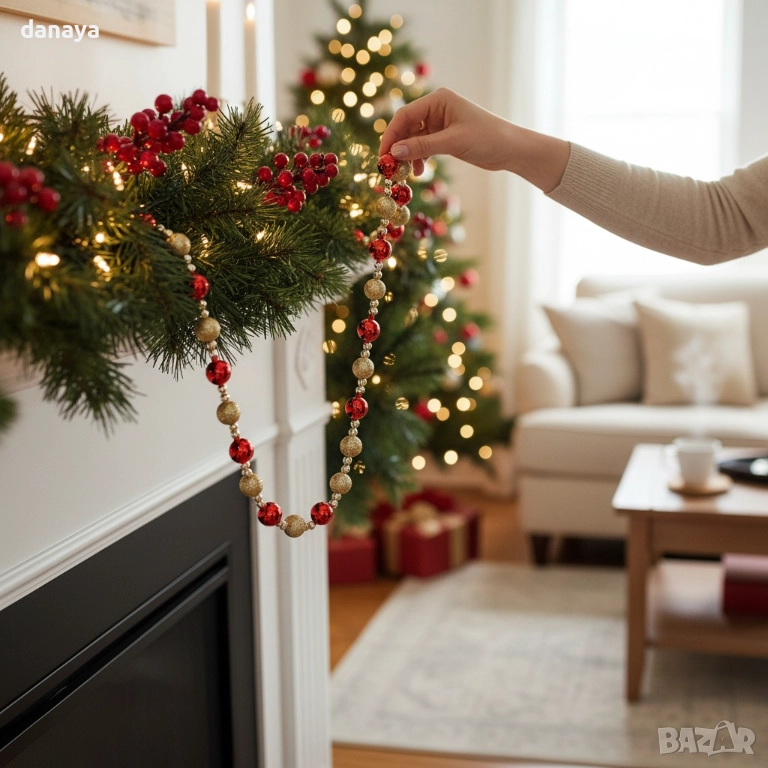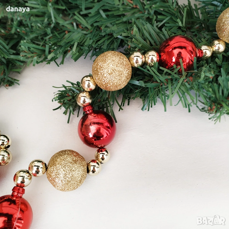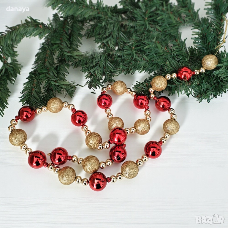 Гирляндът е изработен от леки декоративни топки, подредени в ритмична комбинация от гланцови и брокатени повърхности, които отразяват светлината и създават ефектен празничен блясък. Той е гъвкав, лесен за поставяне и стои стабилно върху елха, камина, парапет, перваз или коледна гирлянда от зелени клонки. Това го прави идеален избор за хора, които искат бързо да придадат по-богат и професионално подреден вид на своята украса.