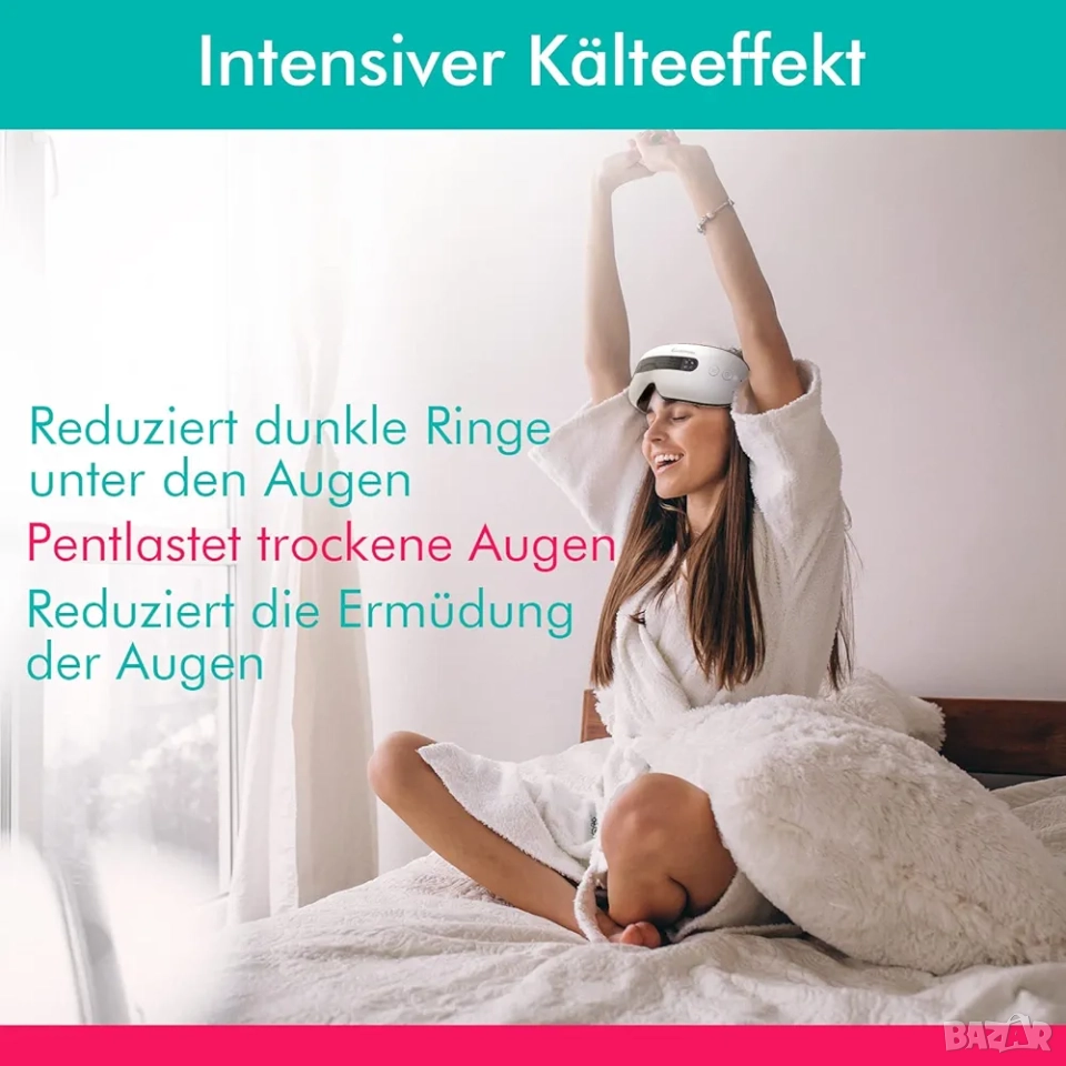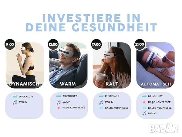 * Константно загряване (40°C): Функцията за горещ компрес ефективно облекчава напрежението, помага при сухота в очите и стимулира кръвообращението. Подходяща за релаксация преди сън.