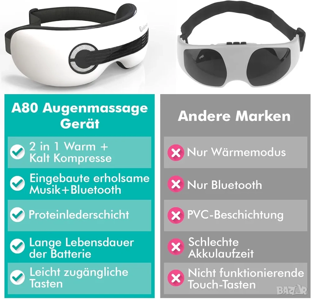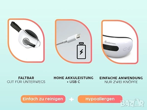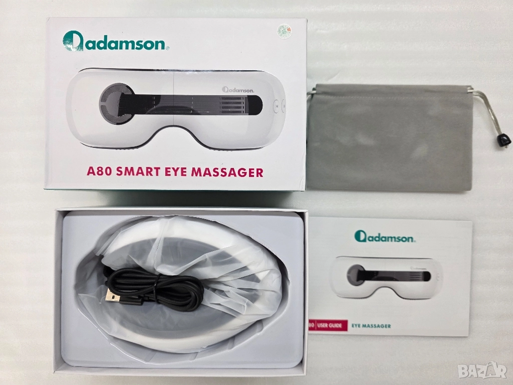 масажор за очи, Adamson A80, шиацу масаж очи, охлаждаща маска за очи, загряващ масажор, облекчаване на мигрена, премахване на тъмни кръгове, сухи очи терапия, Bluetooth масажор, уред за релаксация, очна грижа, акупресура за лице.
