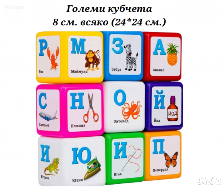 Тези кубчета са насочени към изучаване на азбуката по игрови начин; Ярките и големи букви ще помогнат на детето лесно да запомни българската азбука, а ярките изображения на животни правят учебния процес интересен и вълнуващ; Материали: Висококачествена безопасна пластмаса; Умения: Развитие на паметта, фината моторика, логическото мислене и визуалното възприятие; Учене чрез игра: Подходящо за ранно развитие и подготовка за училищни дейности; Подходящи за: Момичета, момчета; Брой кубчета в комплекта: 9; Различни цветове в комплекта; Вариант големи кубчета: 8 см. всяко (24*24 см.); Вариант малки кубчета: 5,5 см. всяко (16*16 см.); Тегло 450 гр.; Възраст: 3+;