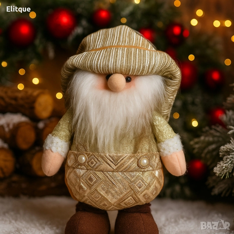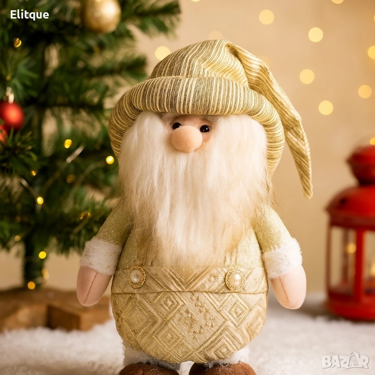 Материали: Изработен от пластмаса, текстил и декоративни перли; Приблизителни размери: 35см; Цветова гама: Бежови и златисти нюанси с белоснежна брада; Почистване: Препоръчва се почистване с мека суха кърпа.