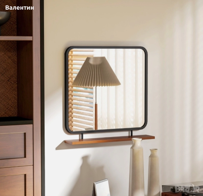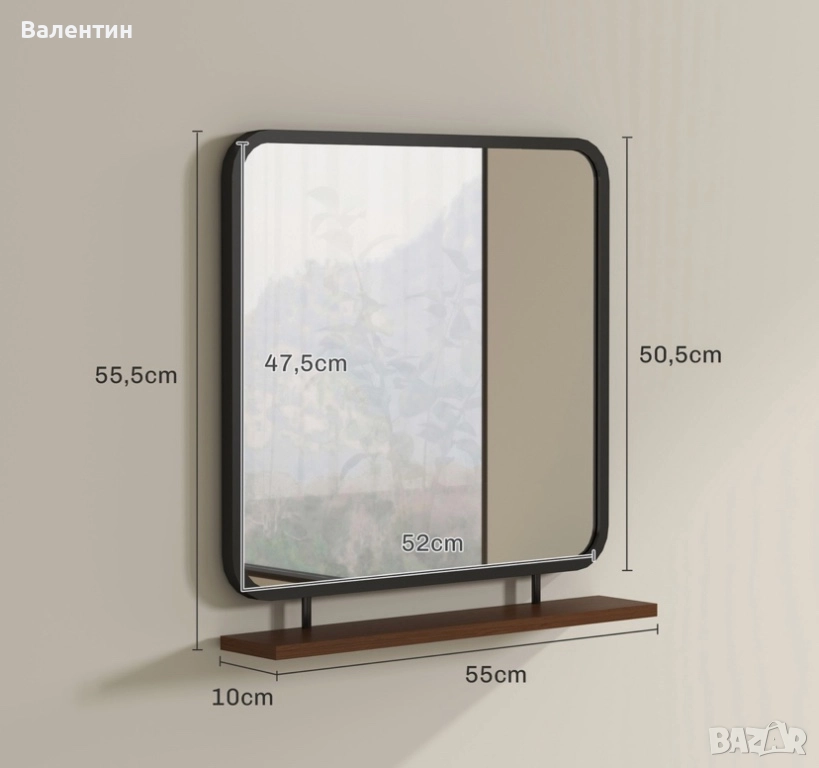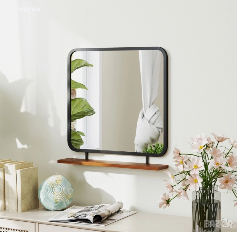 Стенно огледало с дървен рафт 55х55 → Обява 52503317