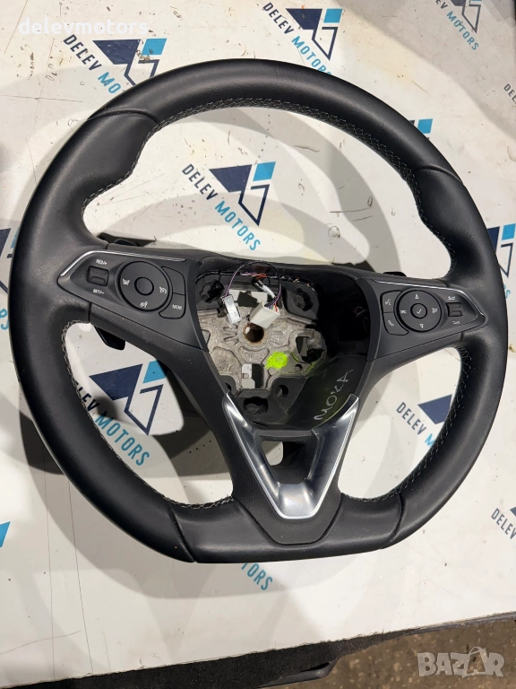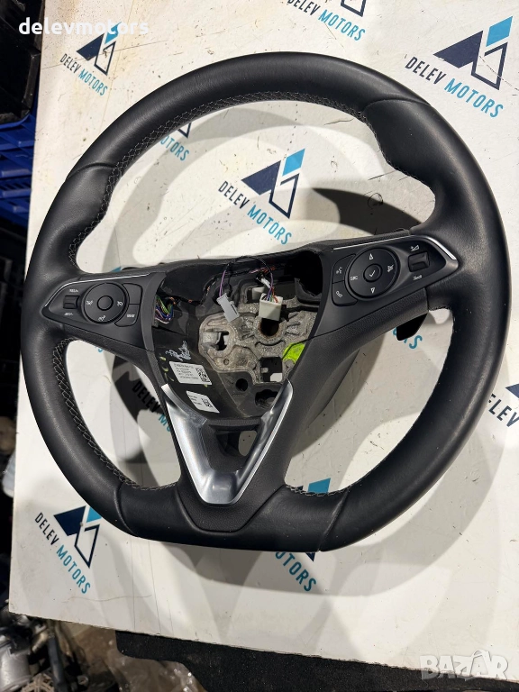 98356599YX трилъчев кожен мултифункционален волан с пера от Opel Mokka 1.2i автоматик,131 кс., двигател HNS, F12XHT (EB2ADTS), 2023, 10700 km, Опел Мока 1.2 automatic, 131кс., engine HNS, F12XHT (EB2ADTS), 2023г., euro 6D в автоморга Delev Motors, между с. Каменар и с. Куманово гр. Варна.