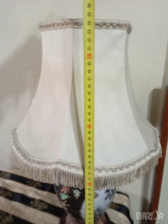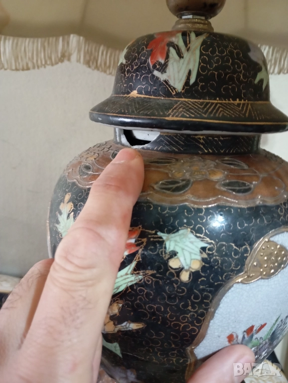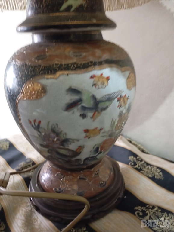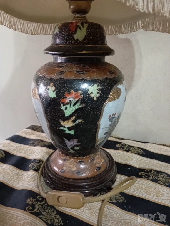 Порцеланов корпус,забележка - посочена е.Корпусът е декориран с техника клетъчен емайл,предполагам е марката Сатцума.Забележки по плата на абажура.